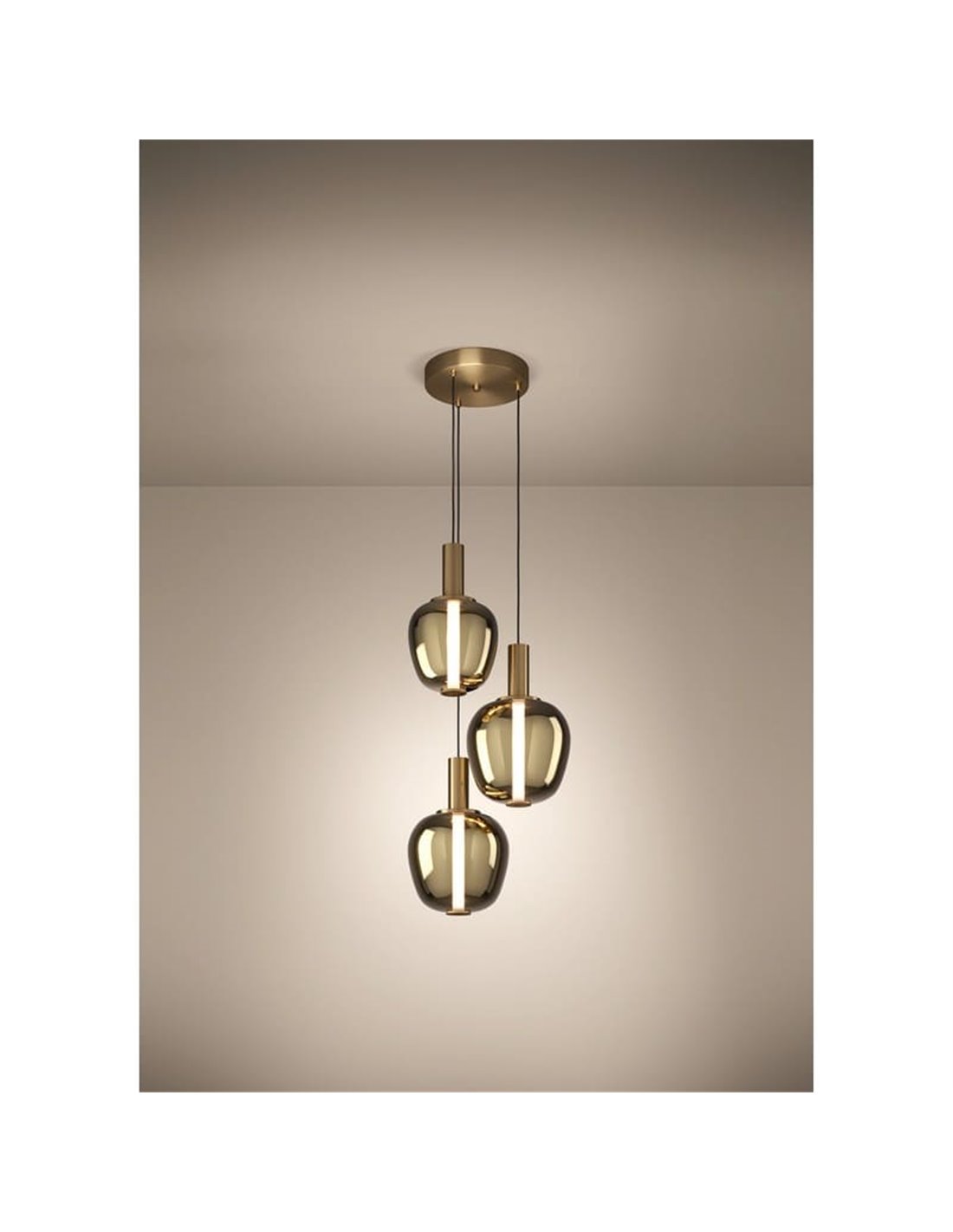 Die LED-Hängelampe mit 3 Lichtern FRUITERA schafft eine elegante runde Komposition mit gebürstetem Messing und vergoldetem Glas. Sie beinhaltet Touchless Sensor-Gestensteuerung, mit Helligkeitsregelung und dimmbarer CCT, um die Umgebung zu personalisieren. Maße: H 1500 mm · Ø 450 mm.
