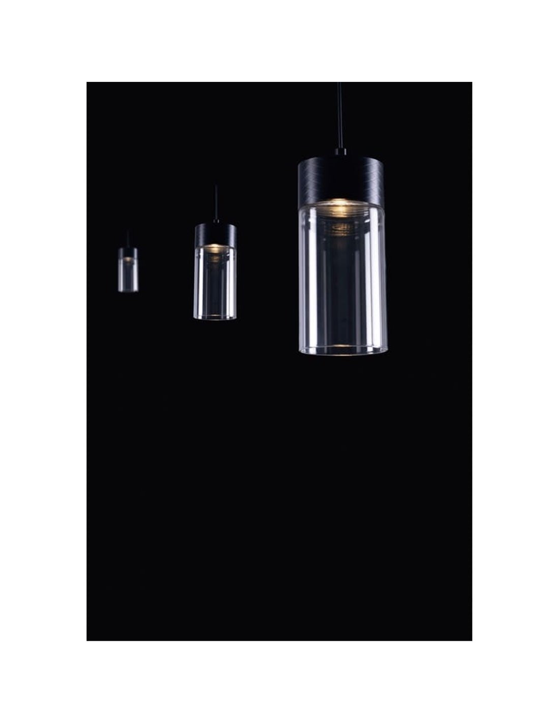 Dank ihrer anspruchsvollen Ästhetik und schlanken Form ist diese Hängelampe ideal zum Platzieren über Esstischen, Kücheninseln oder dekorativen Ecken. Ihr transparenter zylindrischer Schirm ermöglicht eine fokussierte Beleuchtung ohne Blendung, was Charakter verleiht, ohne den Raum zu überladen.
