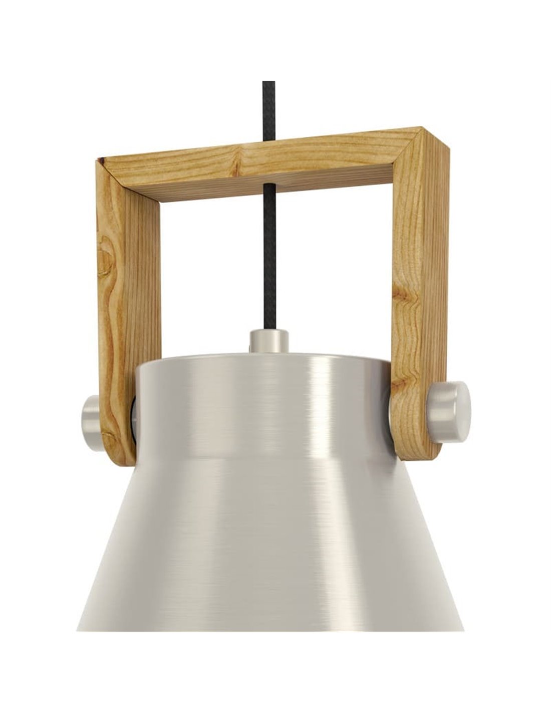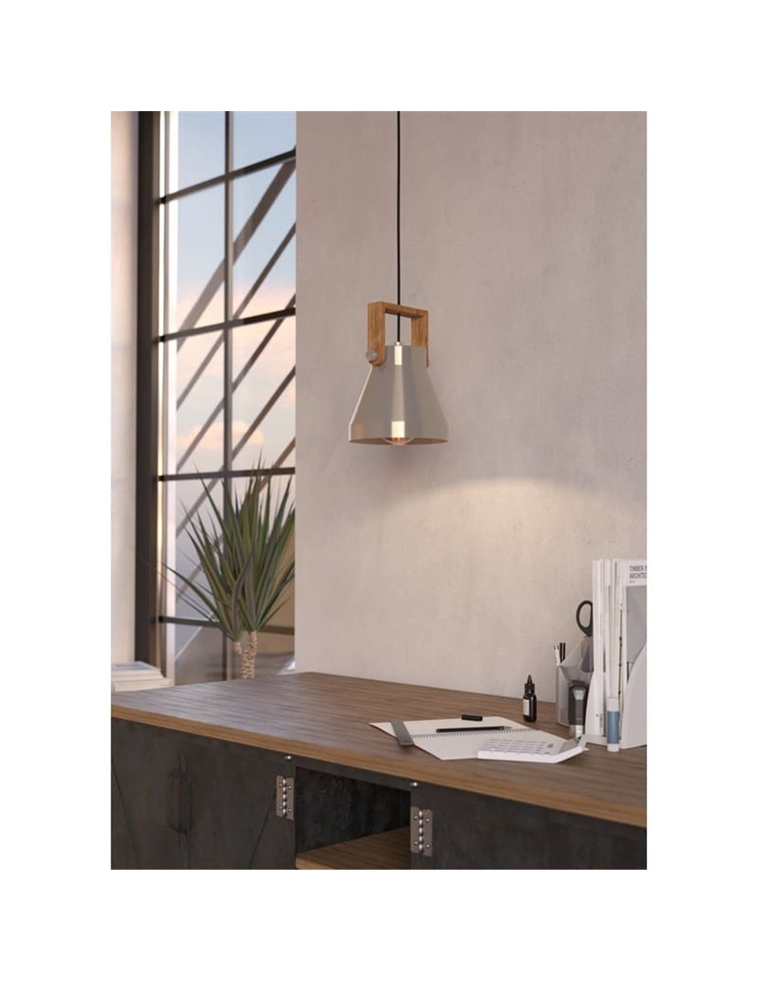 Die Hängeleuchte CAWTON von Eglo kombiniert einen rustikalen Holzfuß mit einem schwenkbaren Schirm aus mattiertem Stahl in cremefarben. Perfekt für moderne und industrielle Stile, bietet diese Lampe ein funktionales und dekoratives Design, das jeden Raum beleuchtet und hebt.
