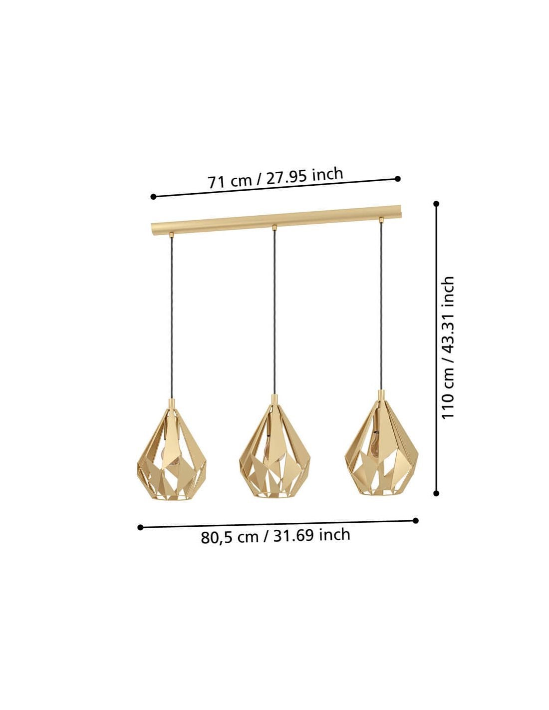 Hängelampe mit 3 Schirmen in goldener Ausführung Carlton vom Hersteller Eglo Beleuchtung, verfügt über 3 goldfarbene Stahlscheiben mit einer Deckenhalterung in Goldfarbe, die es ermöglicht, die Höhe der Schirme bis zu maximal 110 cm zu regulieren.