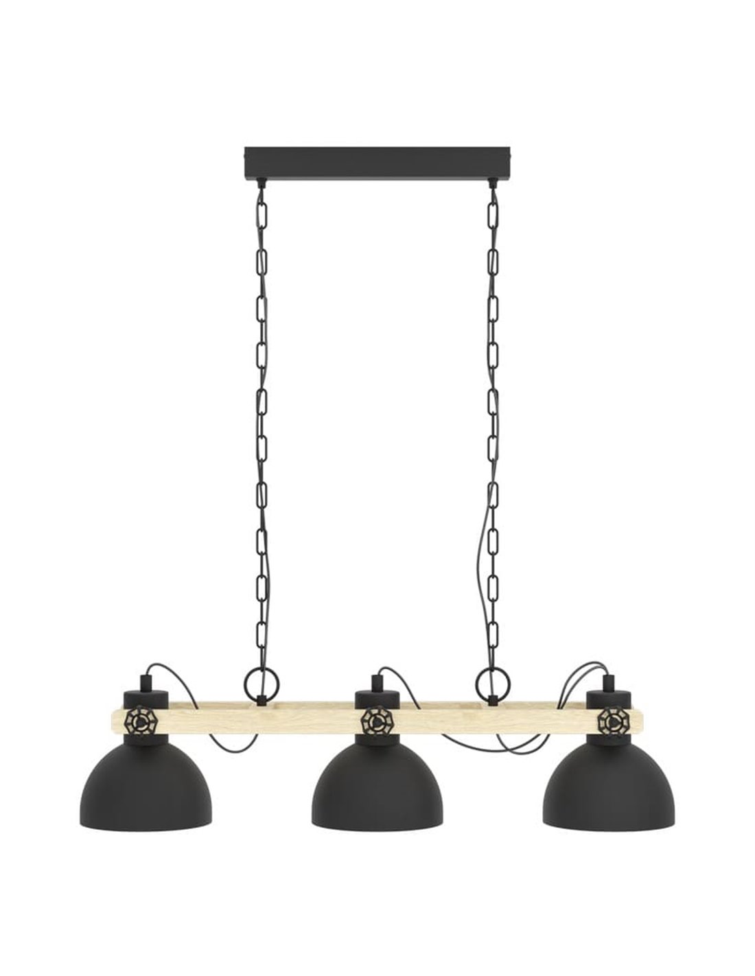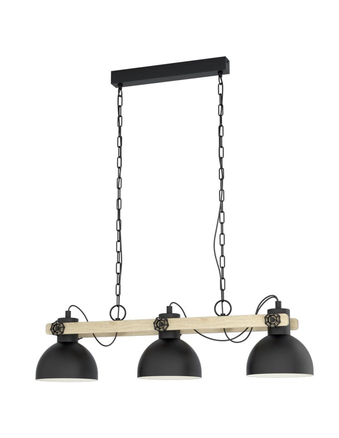Hängelampe LUBENHAM von EGLO, mit 3 drehbaren Schirmen aus schwarzem Metall und cremefarbenem Inneren, verbunden mit einem eleganten Holzkörper. Ideal für vintage und industriellen Stil. Glühbirnen nicht enthalten.