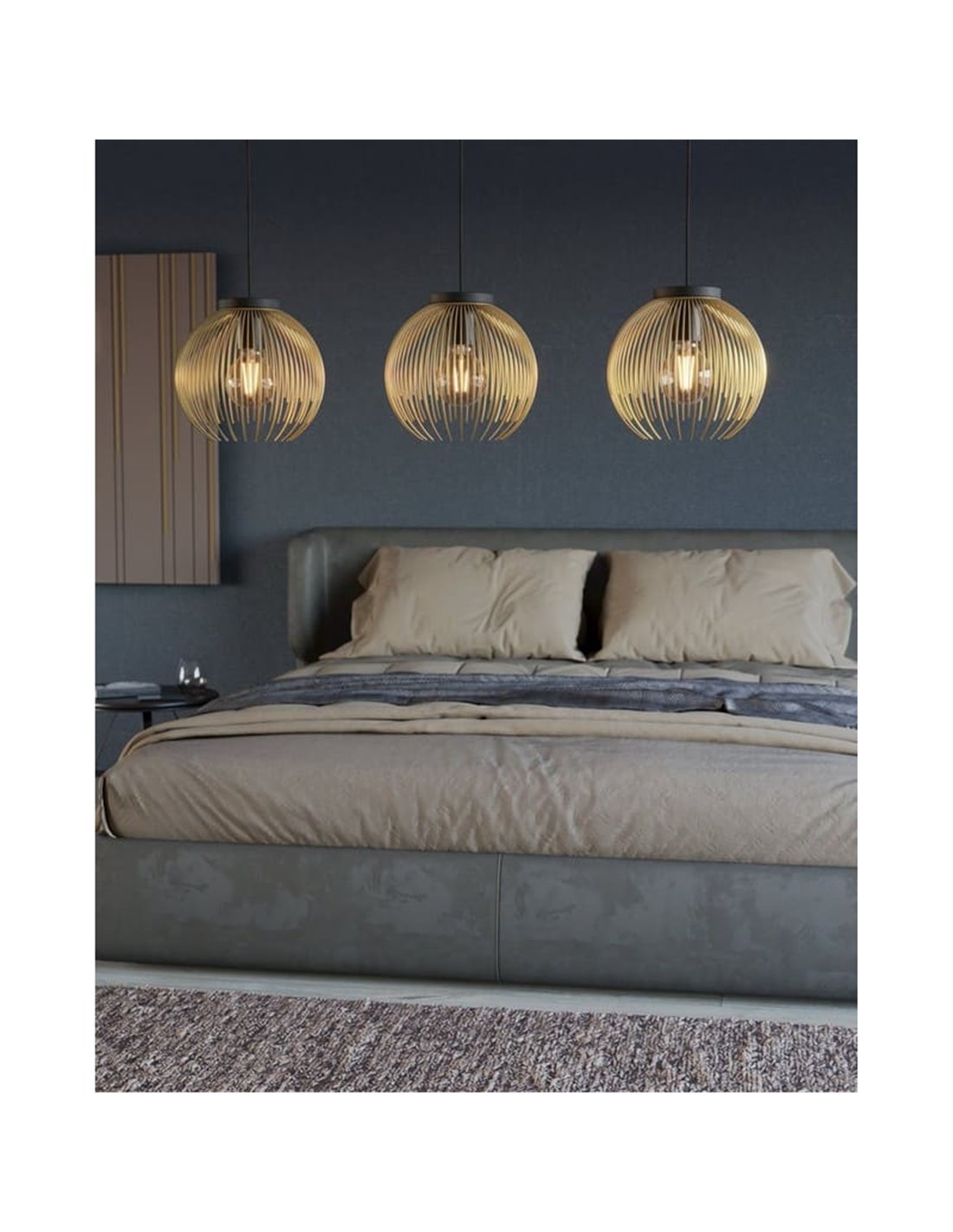Die Hängelampe 3 Lichter VENEZUELA zeigt eine Silhouette mit klaren Linien und einer Stahlkonstruktion, die in Schwarz und Gold abgeschlossen ist. Der Schirm hängt an einem verstellbaren Kabel, um die Höhe an den Raum anzupassen. Der Diffusor sorgt für eine homogene Beleuchtung ohne Blendung.