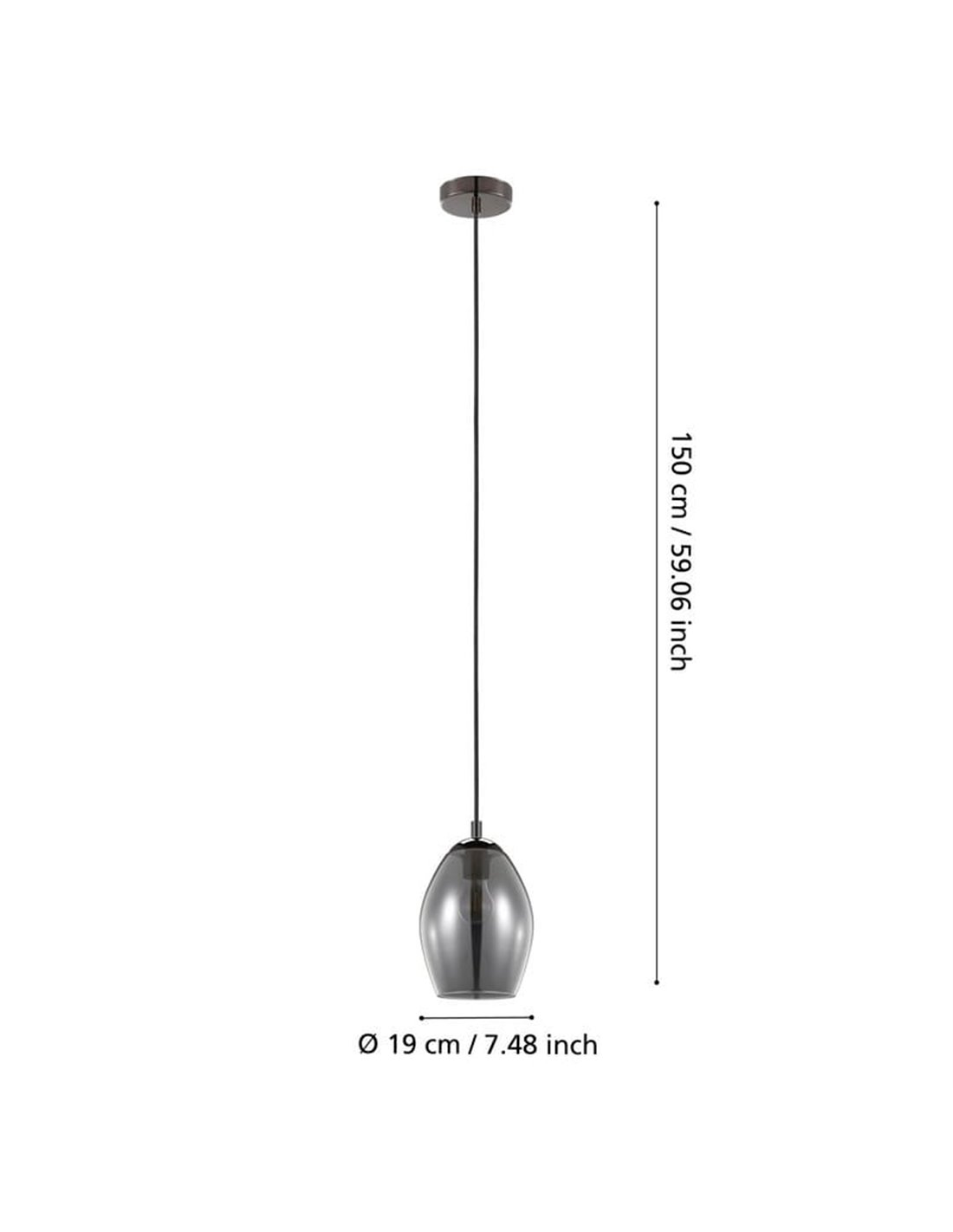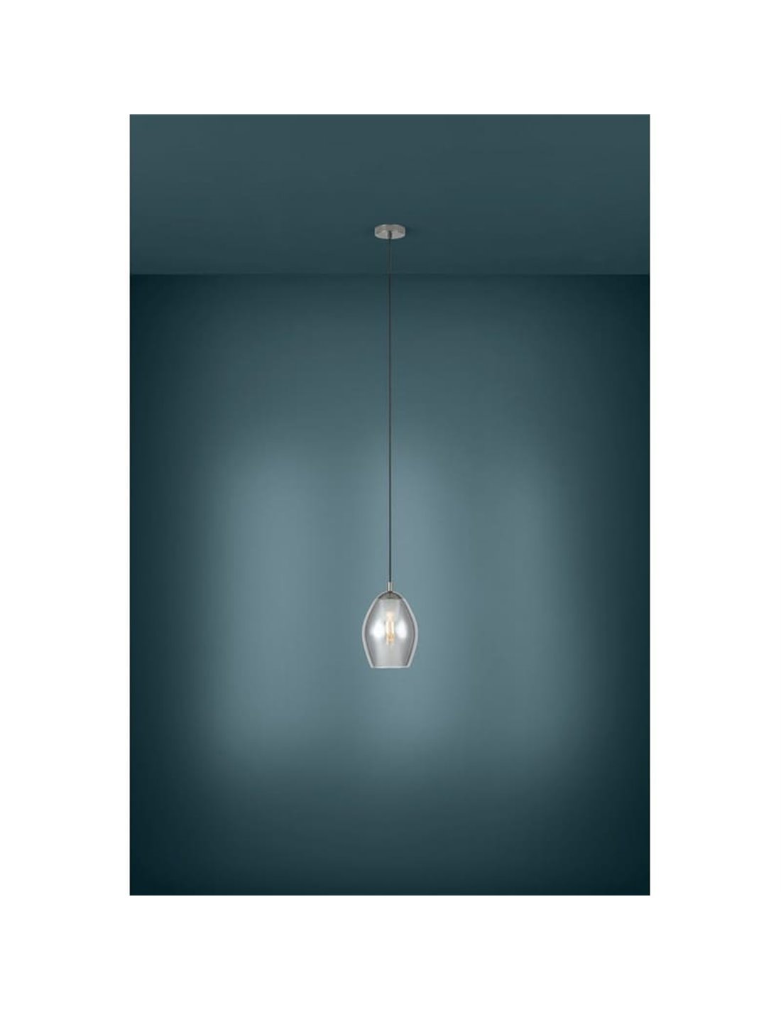 Hängeleuchte ESTANYS von EGLO: rauchglas-transparent und Gehäuse aus Stahl mit nickel-schwarzem Finish. Fassung E27 (Glühbirne nicht enthalten), IP20. Höhe einstellbar 50–150 cm, Durchmesser 19 cm. Textilkabel schwarz.