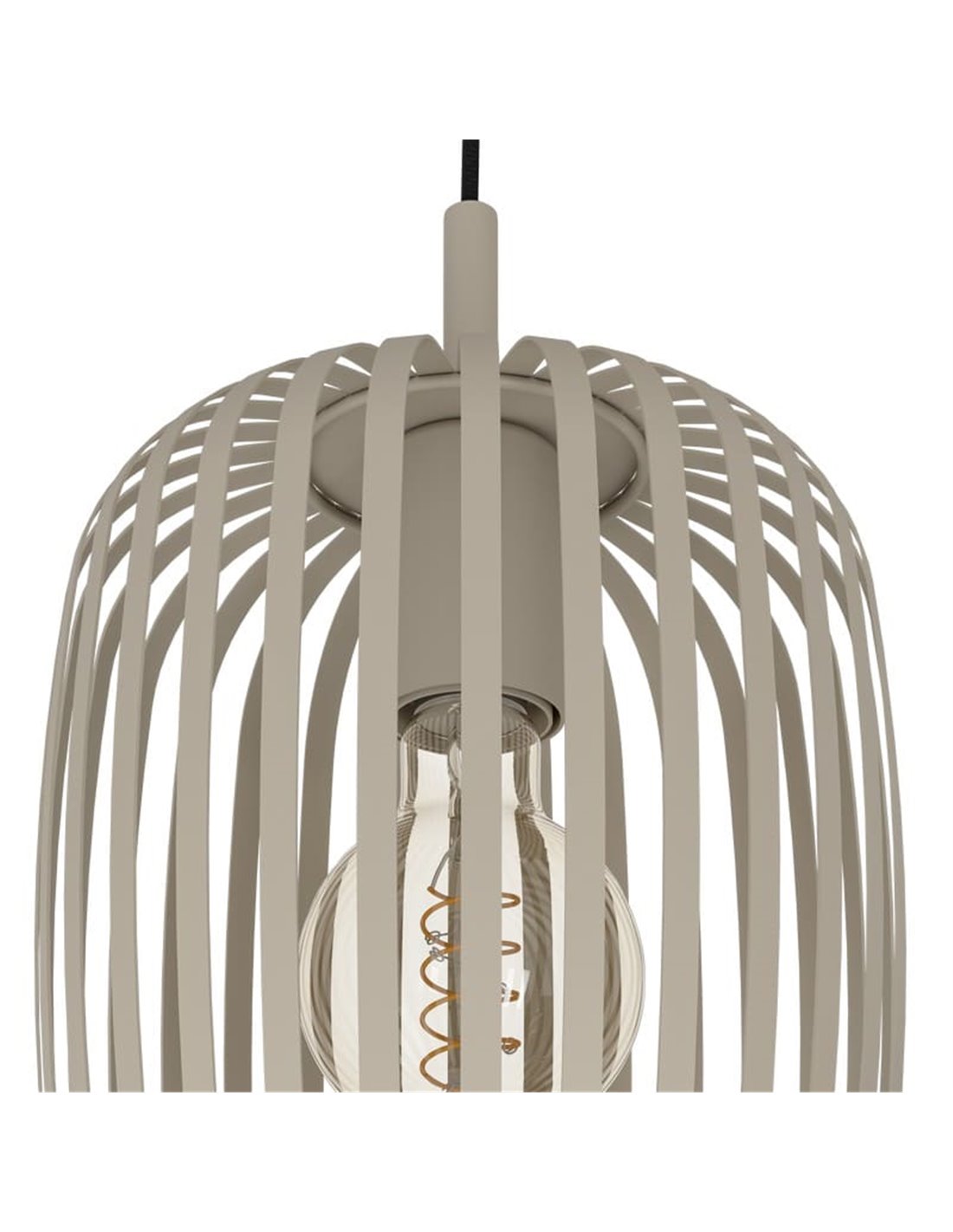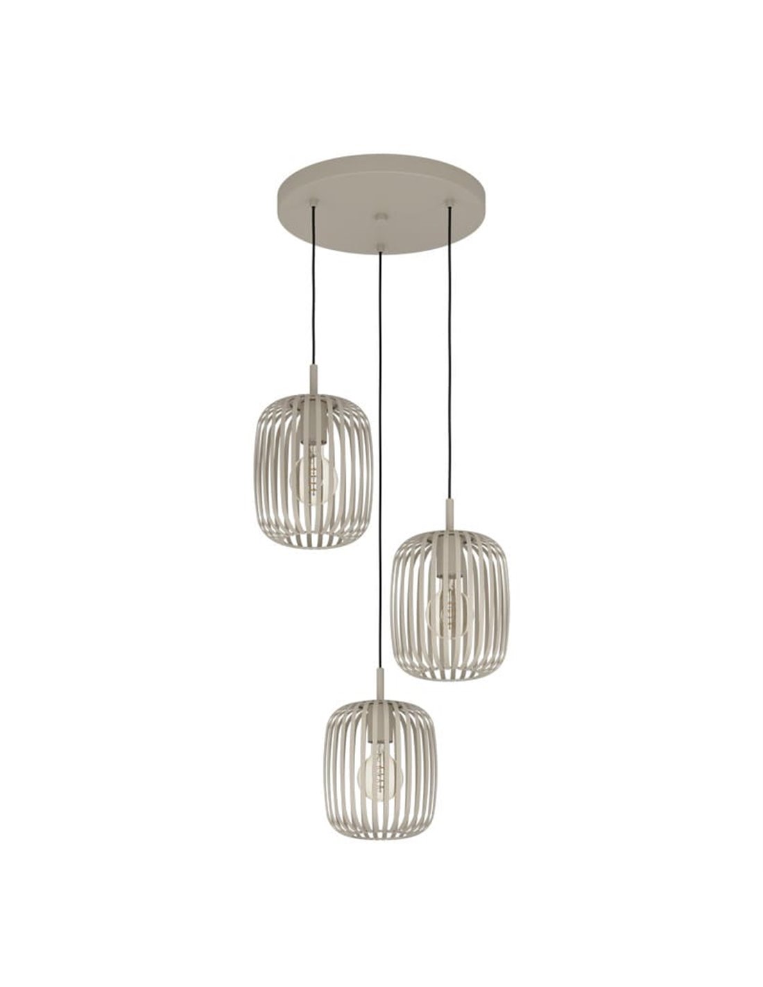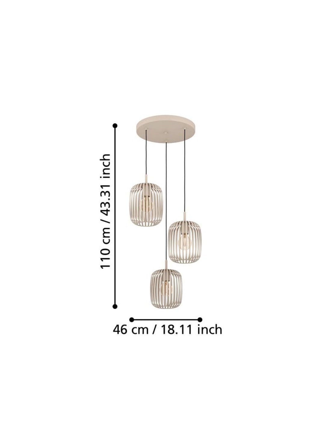 Hängelampe mit runder Basis, die 3 runde Lampen in verschiedenen Höhen der Serie ROMAZZINA von EGLO in sandfarbenem Finish mit E27 für Innenräume. Abmessungen: ↕ 1100 mm | Ø 460 mm.