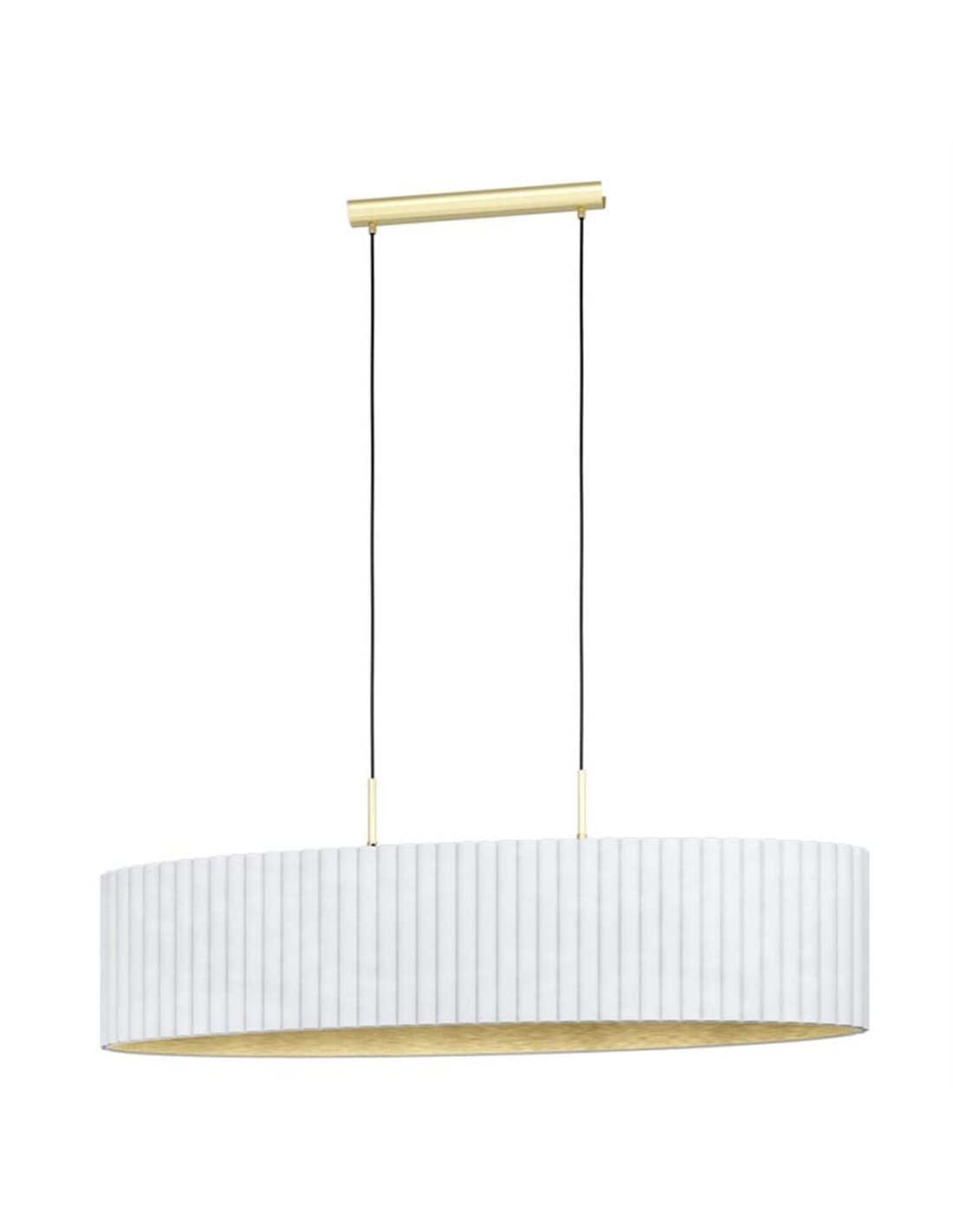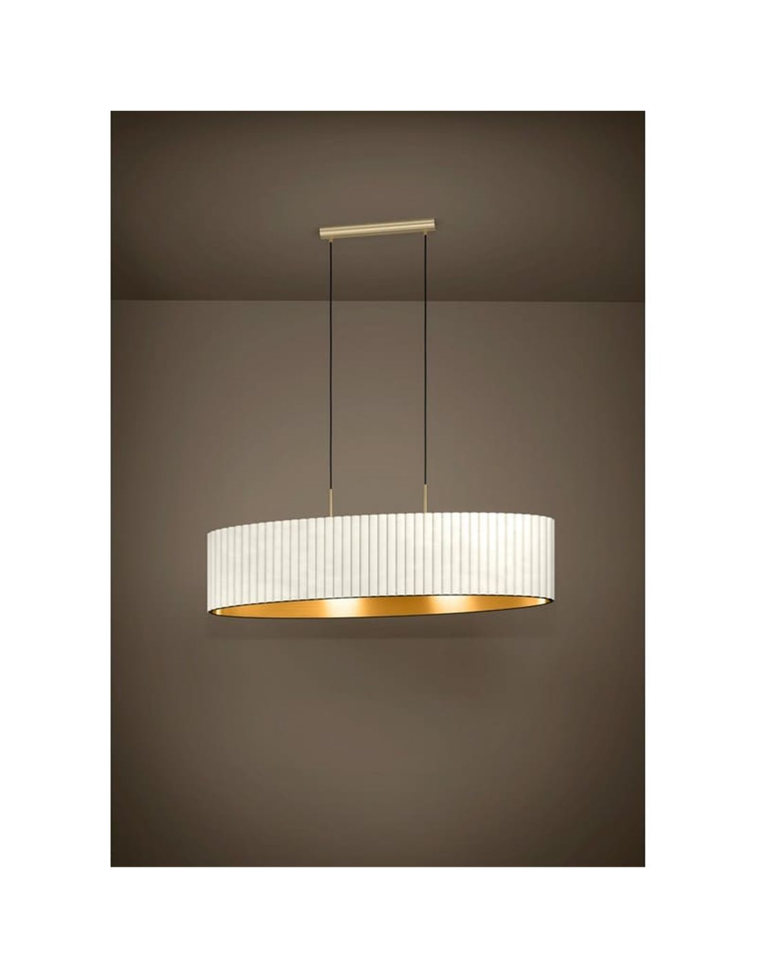 Hängeleuchte TAMARESCO von EGLO mit 2 × E27 (nicht inkl.) und ovaler weißer Samtschirm mit goldfarbenem Inneren, beschichtet mit gebleichtem Messing. IP20 für Innenräume. Höhenverstellbar bis 1500 mm; Gehäuse aus Stahl. Maße ca.: 1020 × 300 mm (Länge × Breite).