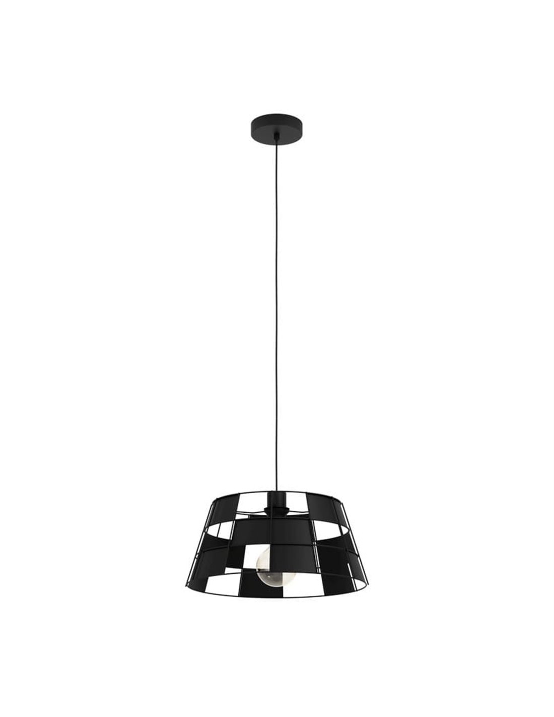 Hängelampe PONTEFRACT von Eglo, mit Basis und Schirm aus schwarzem Metall, die faszinierende Licht- und Schattenspiele projizieren. Kompatibel mit E27-Glühbirne (nicht enthalten). Ideal für industrielle und moderne Umgebungen.