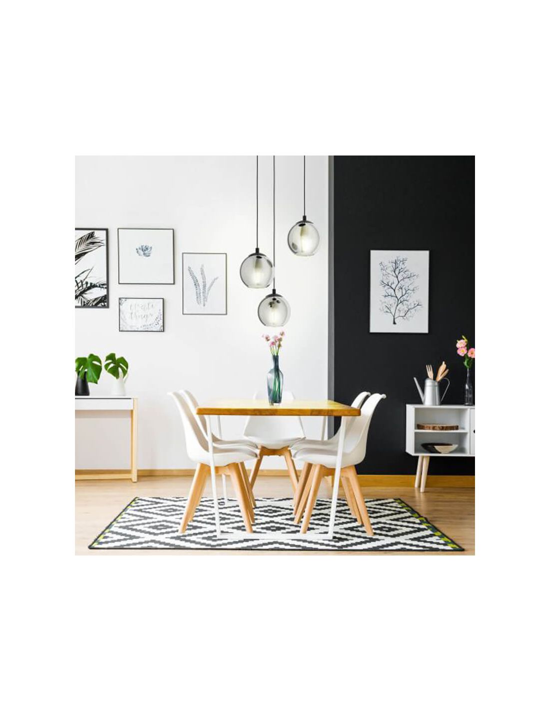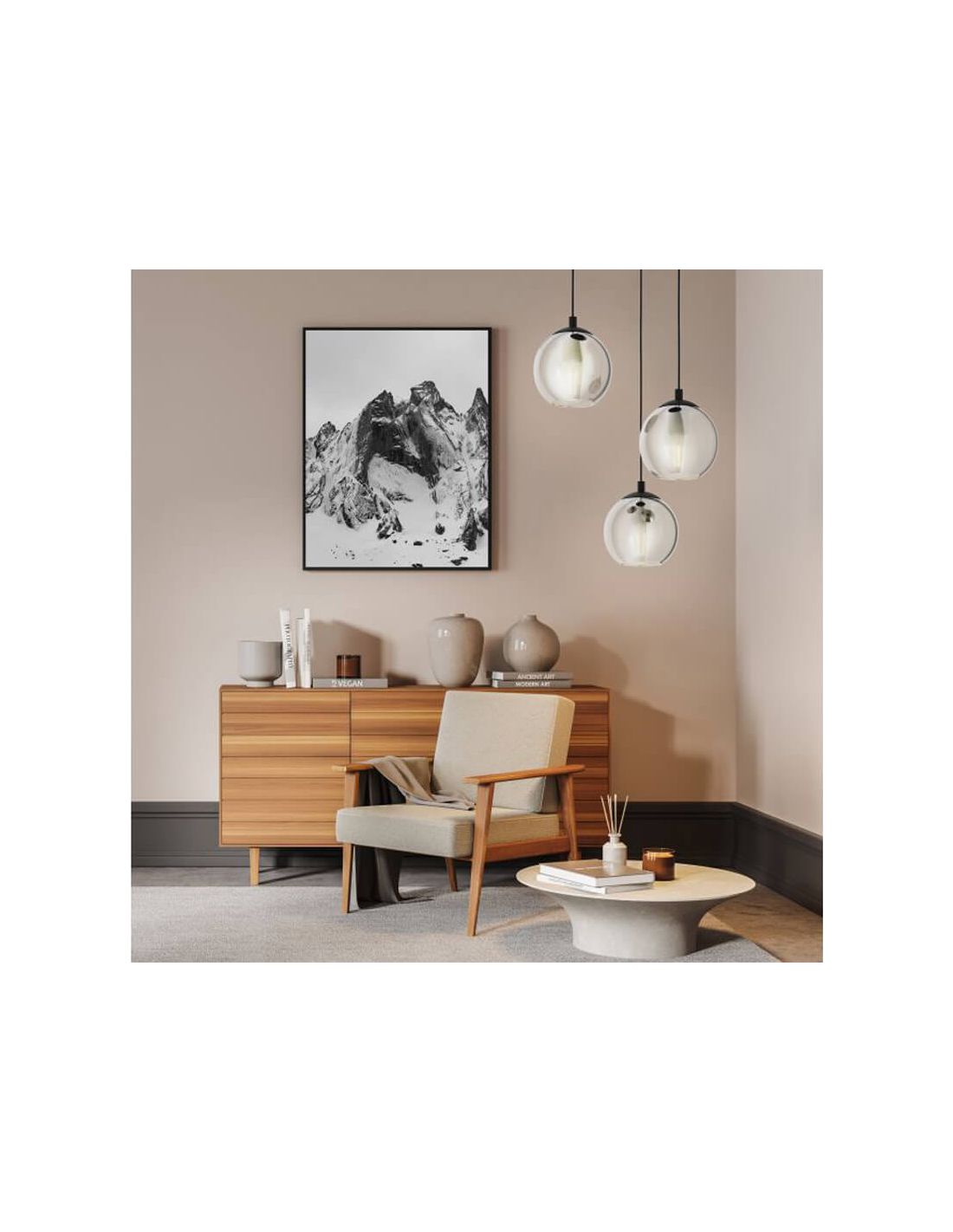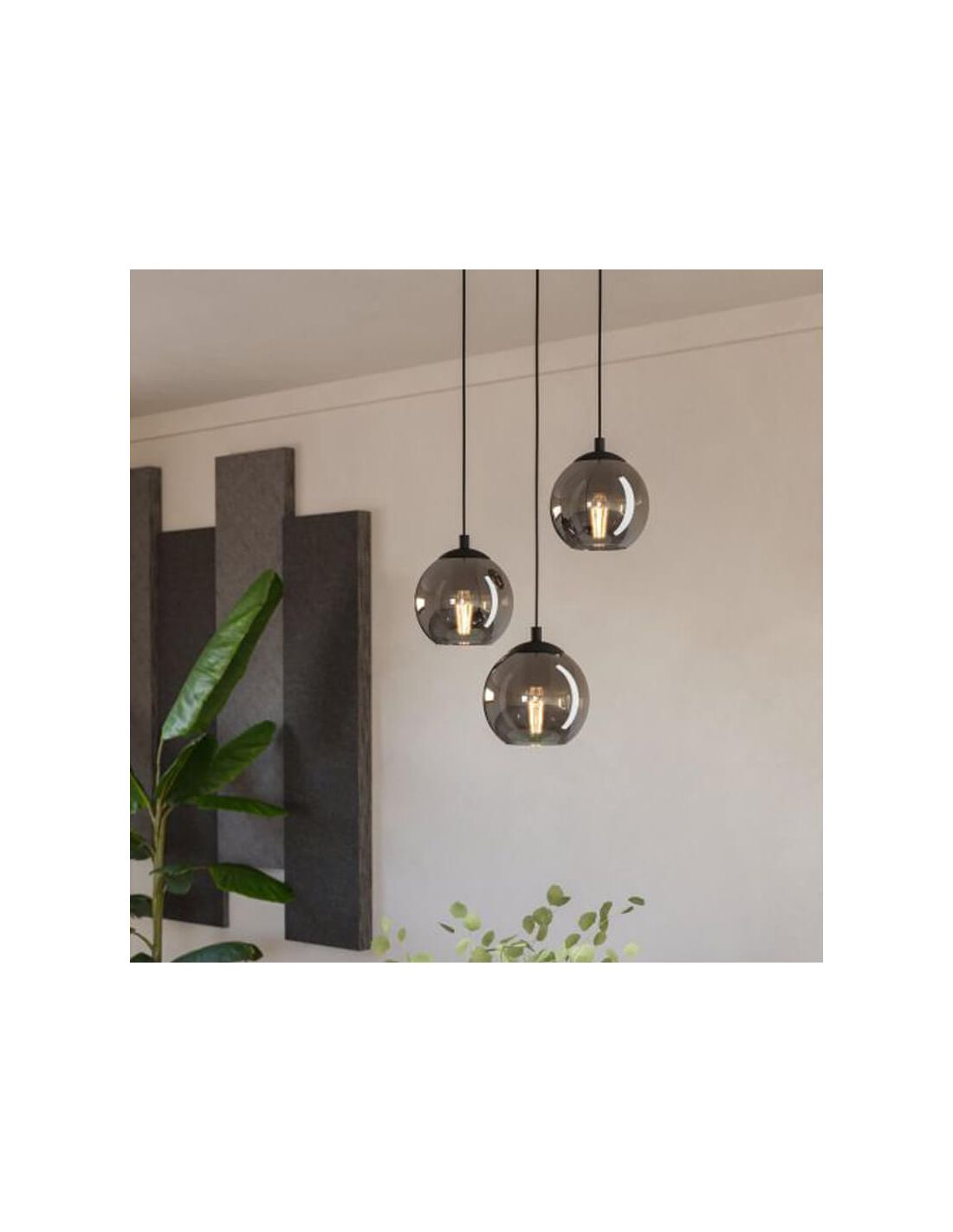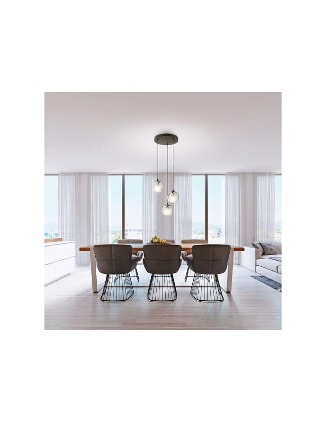 Darüber hinaus hat diese runde Pendelleuchte mit 3 Lichtern Ariscani eine runde Form mit drei Glaskugeln, die in unterschiedlichen Höhen angeordnet sind, aus transparentem Schwarz, die, wenn ihre Glühbirnen leuchten, einen magischen Effekt erzeugen und eine sehr gemütliche Atmosphäre schaffen. Es ist notwendig, drei Glühbirnen mit E27 Fassung (nicht enthalten) zu installieren, von denen wir empfehlen, dass sie LED-Technologie besitzen, um den Energieverbrauch zu senken und Kosten zu sparen, dass die Glühbirnen Filamente haben und eine natürliche weiße Lichtfarbe abgeben.