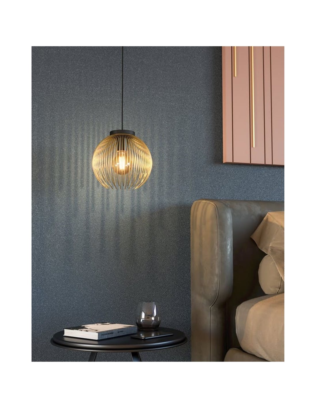 Die Hängelampe 1 Licht VENEZUELA hat eine Stahlstruktur mit schwarzem und goldenem Finish, klare Linien und zeitgemäße Ästhetik. Der Schirm hängt an einem verstellbaren Kabel, um die Höhe an den Raum anzupassen. Der Diffusor ermöglicht ein gleichmäßiges und angenehmes Licht.