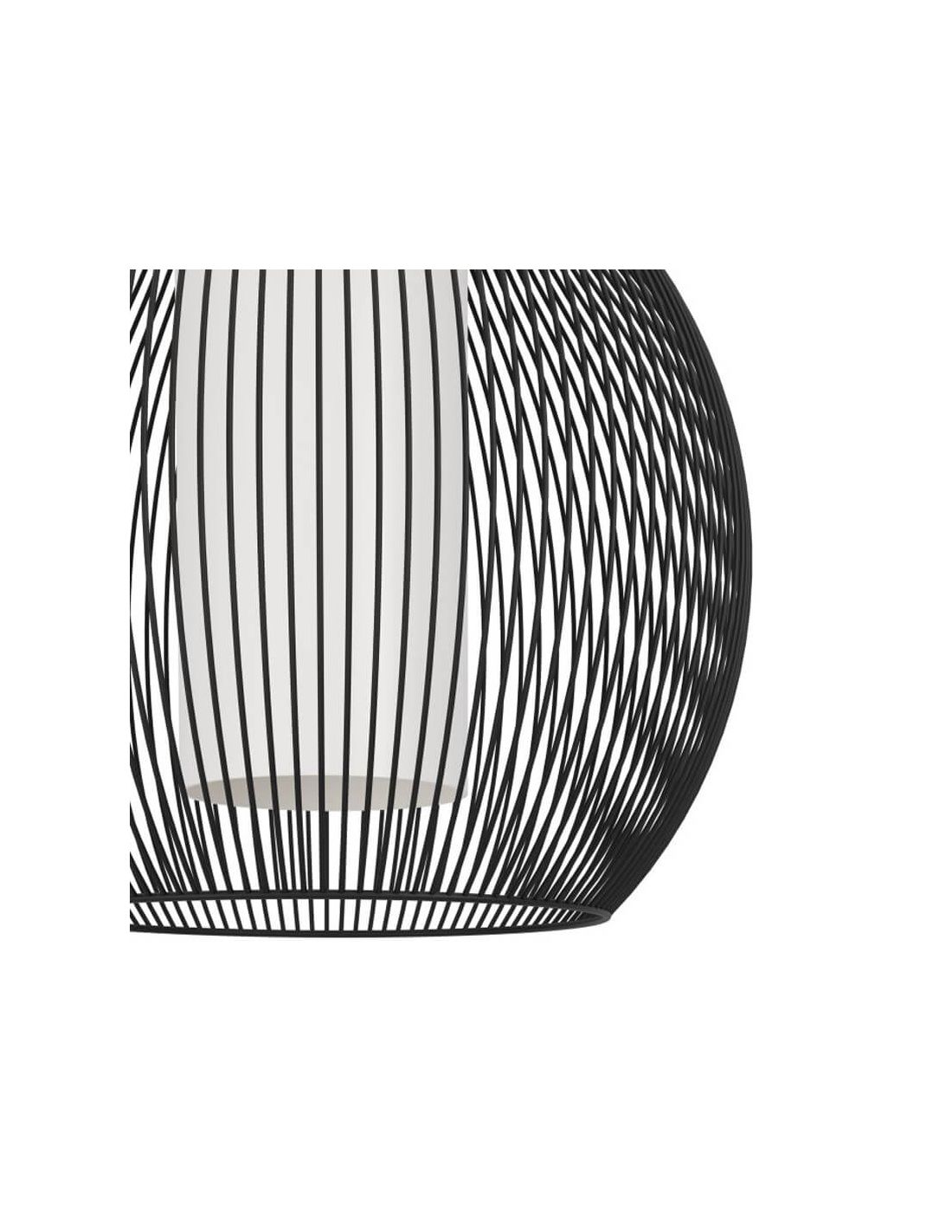 Die RAZONI 1 in schwarzem Finish besticht durch ihr offenes Metall-Design und einem inneren Schirm aus weißem Glas, was einen eleganten und zeitgemäßen Kontrast schafft. Dieses Modell der Serie RAZONI wird zum perfekten visuellen Mittelpunkt für industrielle Umgebungen, Lofts oder moderne Designräume.