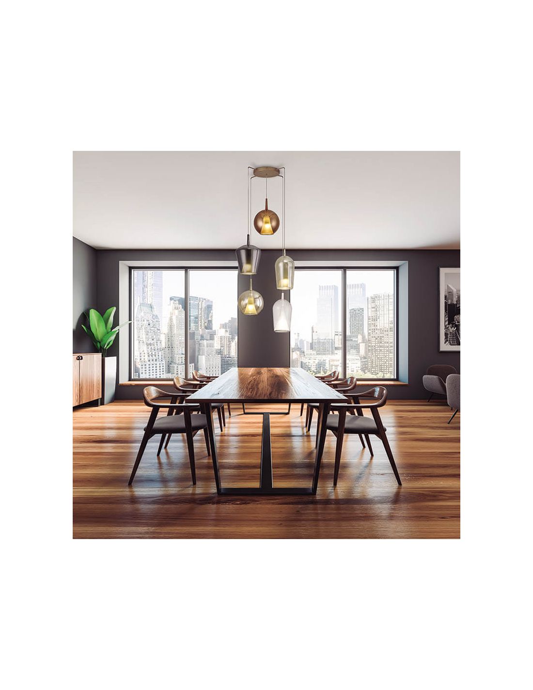Die 5 Elsa-Lampen, die von der Basis hängen, bestehen aus Stahl und Glasschirm in verschiedenen Ausführungen: bronze, transparent, kupfer und chrom, und schaffen damit ein sehr ansprechendes dekoratives Spiel für aktuelle und elegante Innenräume. Darüber hinaus hat sie die IP20-Klassifizierung, die sie ideal für den Innenbereich macht und in Räumen wie Büros hervorsticht.