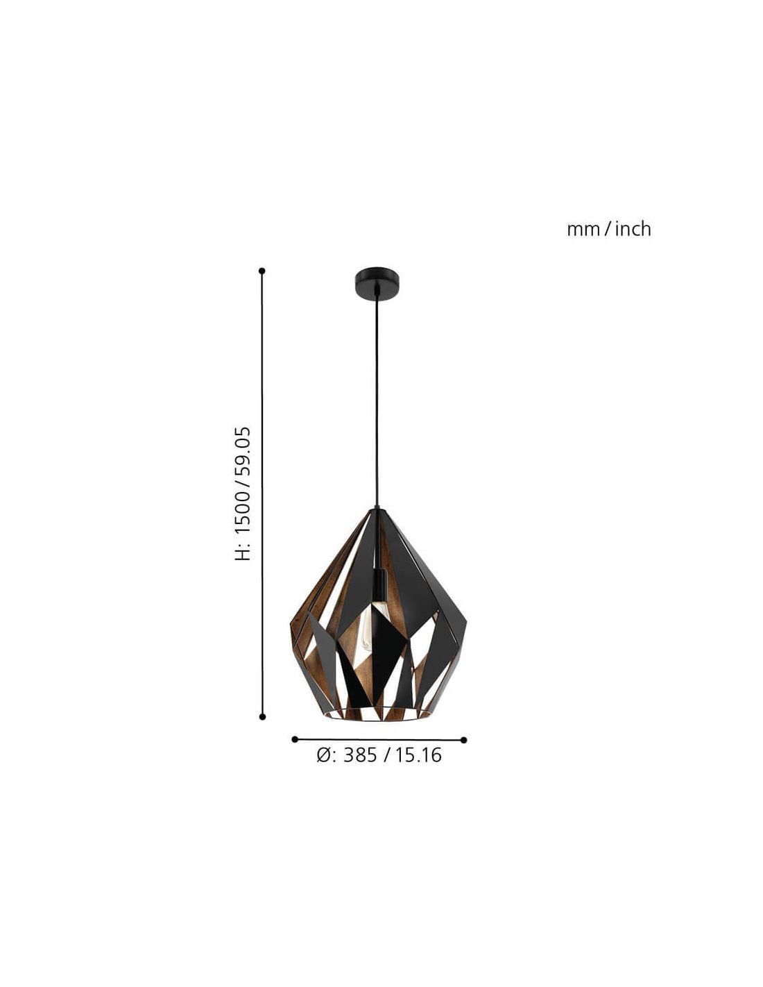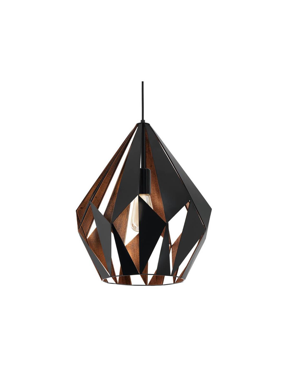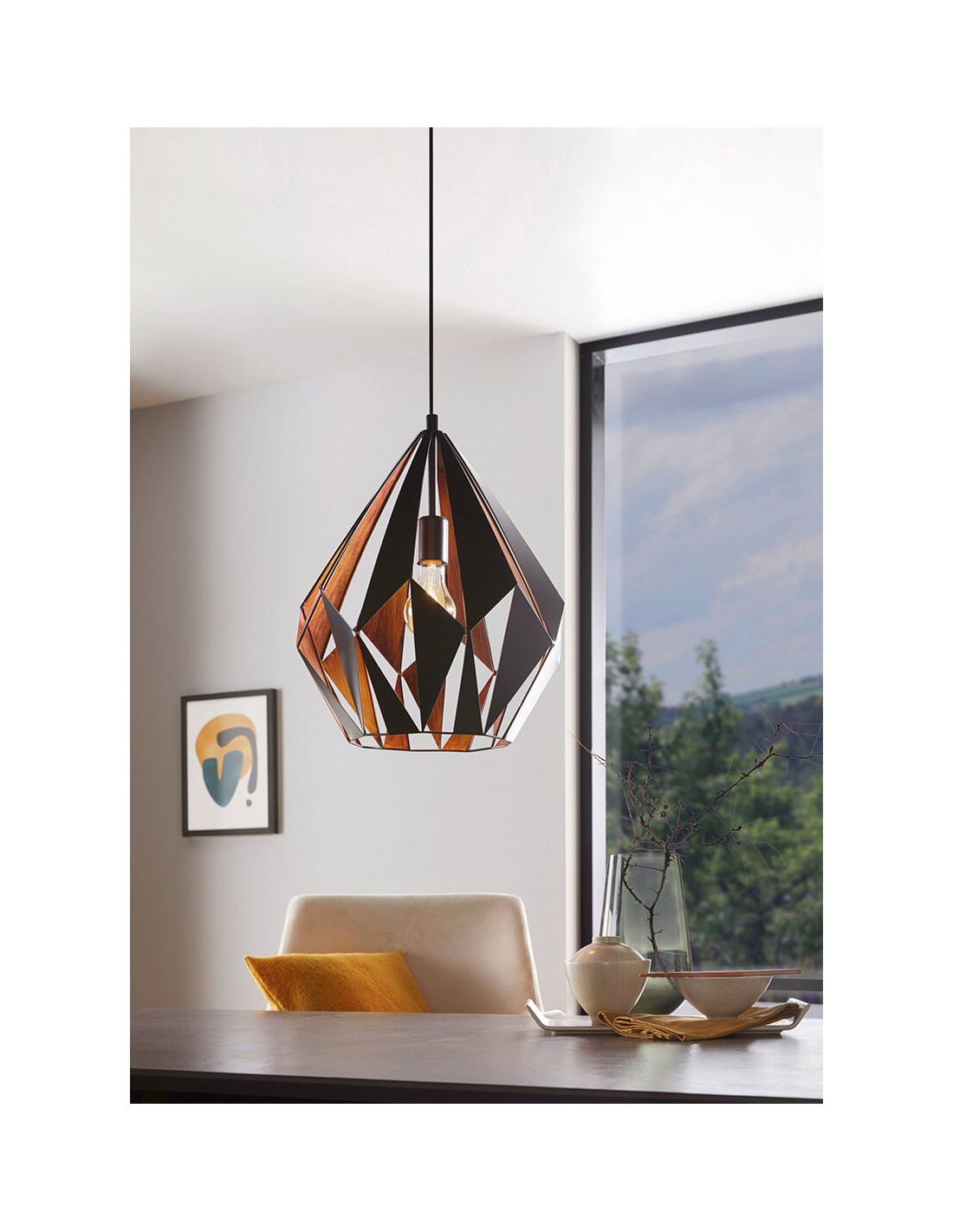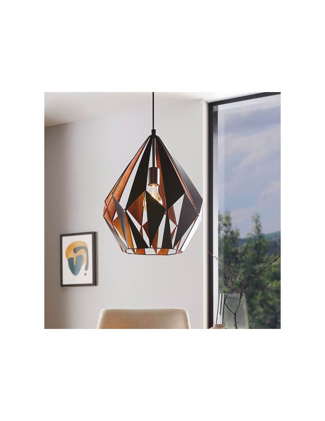 Verleihen Sie Ihrem Zuhause mit der Hängeleuchte CARLTON 1 einen Hauch von Stil und Raffinesse. Ihr geometrisches Design in Diamantform, gefertigt aus schwarzem Metall mit einem eleganten Innenraum in Kupferfarbe, erzeugt ein faszinierendes Spiel von Licht und Schatten und verleiht jedem Raum Charakter und Persönlichkeit.