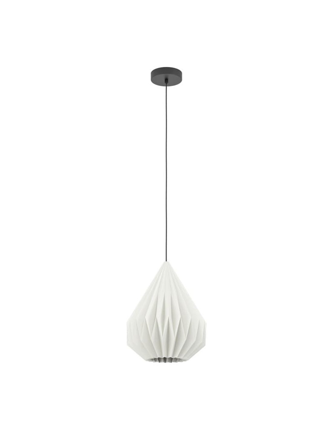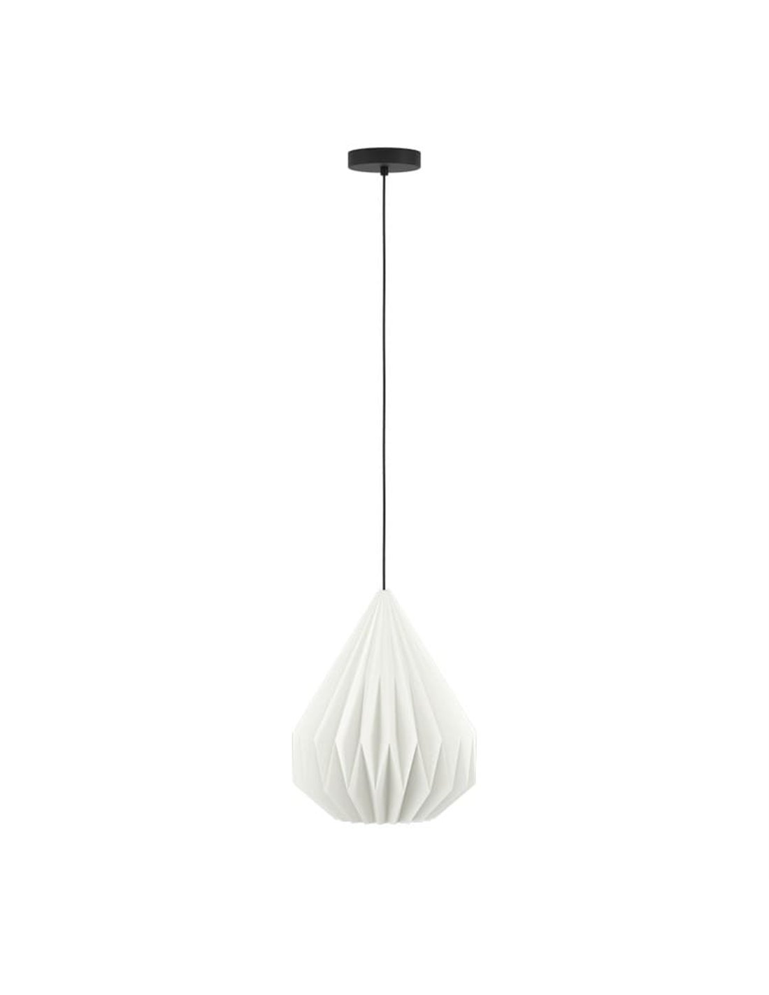 Hängeleuchte MINTING von Eglo, mit tropfenförmig gefaltetem Papierschirm in Weiß und schwarzem Metallpendel. Kompatibel mit E27-Glühbirnen (nicht im Lieferumfang enthalten). Ideal, um moderne und skandinavische Räume zu beleuchten.