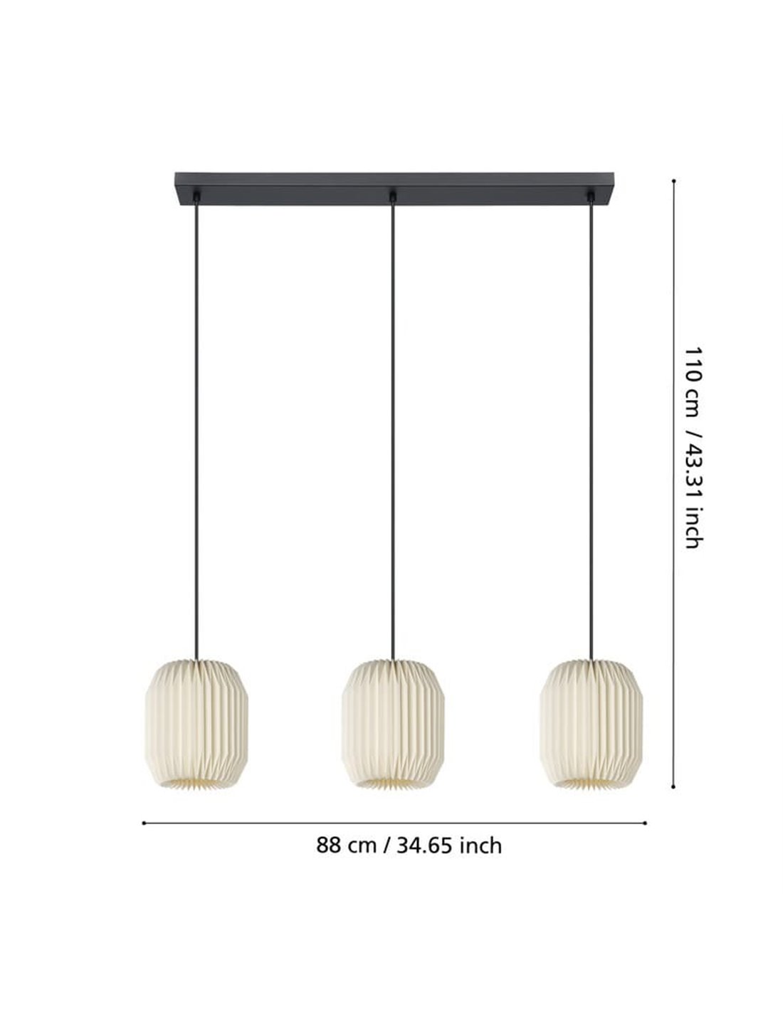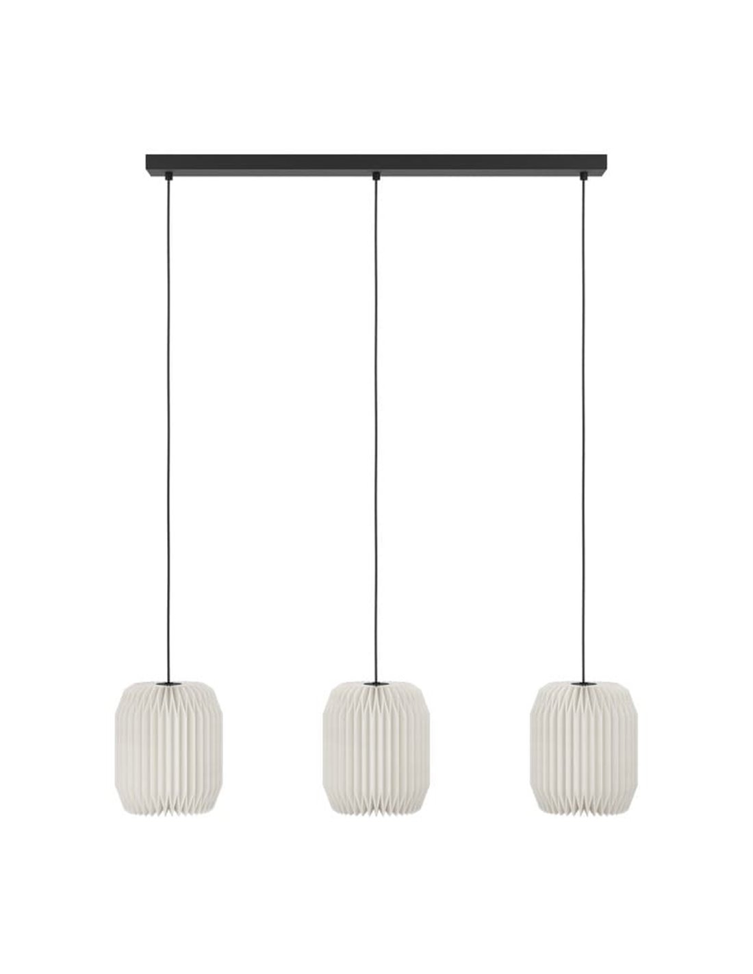 Hängeleuchte Triple BELGRAVE von Eglo, mit drei weißen Papierschirmen und schwarzem Stahlgestell. Kompatibel mit E27-Glühbirnen (nicht im Lieferumfang enthalten). Ideal, um jedem großen Raum einen modernen und eleganten Akzent zu verleihen.