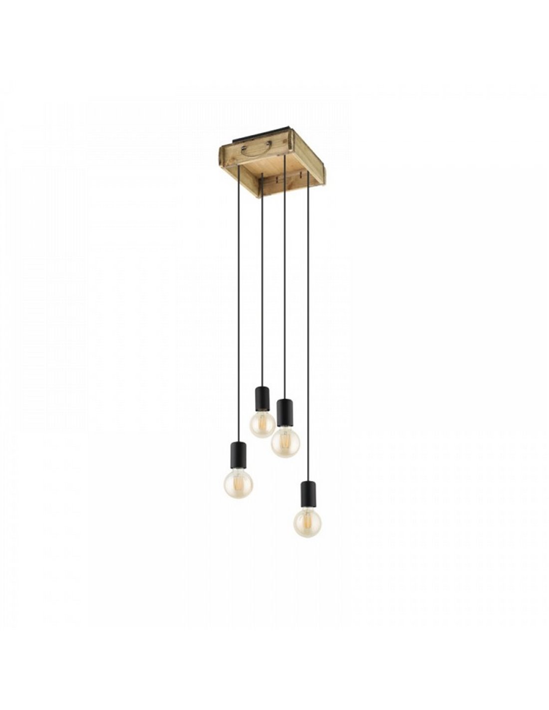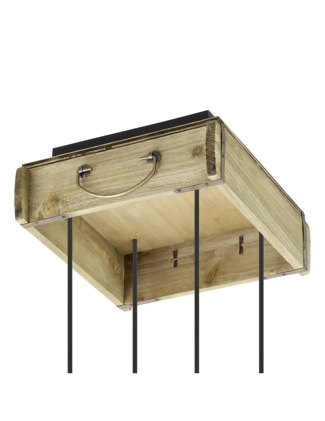 Hängeleuchte WOOTTON von Eglo, mit Vintage-Holzkiste und 4 Metallfassungen in Schwarz in unterschiedlichen Höhen. Kompatibel mit E27-Glühbirnen (nicht enthalten). Ideal zur Beleuchtung von Wohnzimmern und Esszimmern im industriellen und modernen Stil.