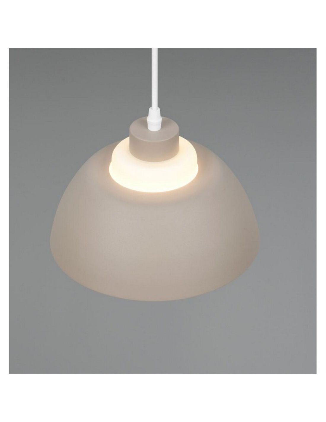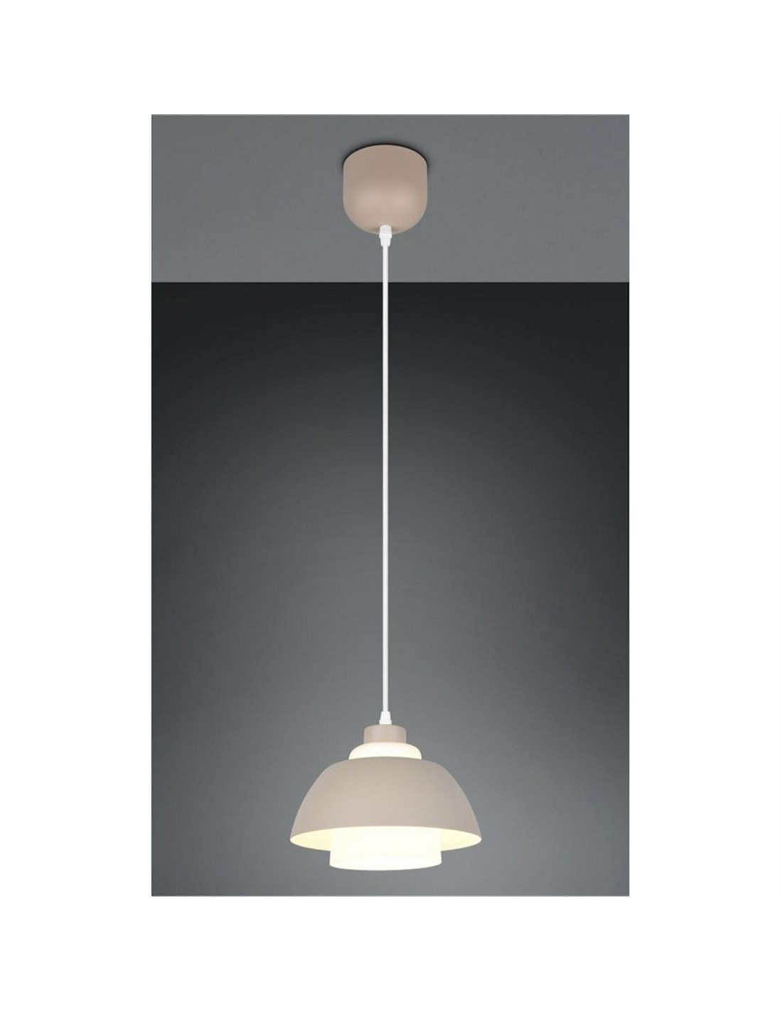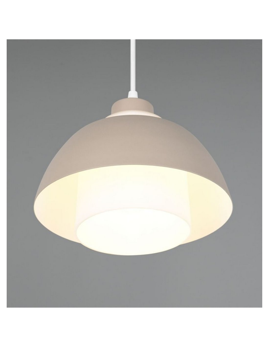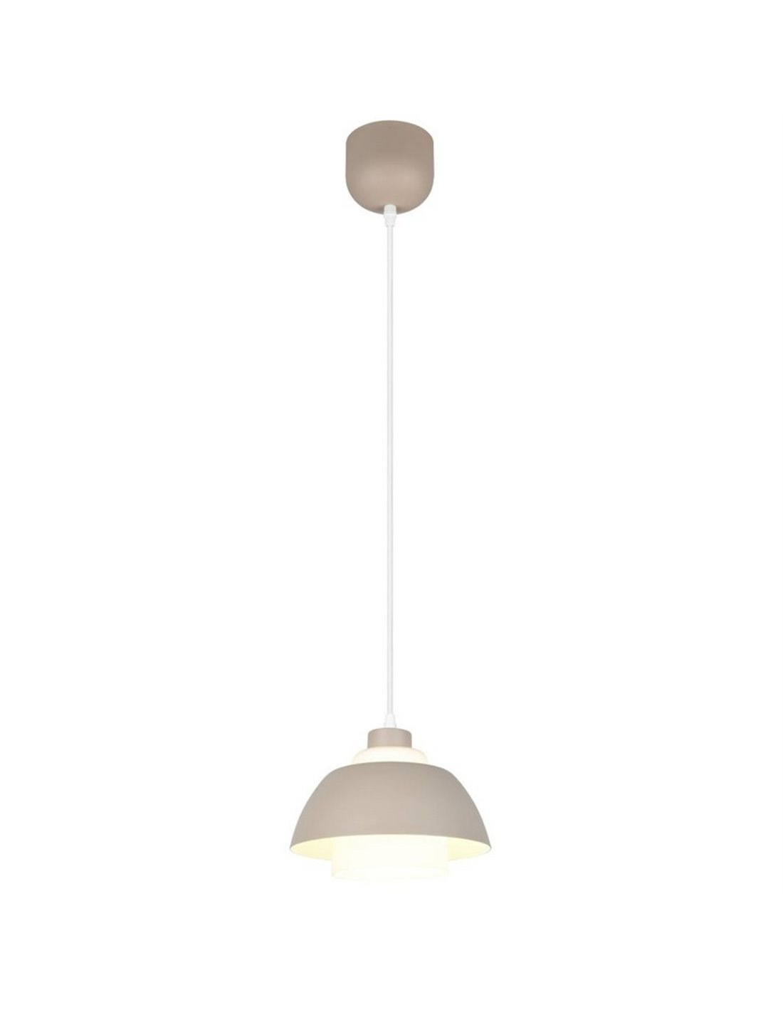 Die hängende TILOS-Lampe kombiniert eine Struktur aus warmbeigem Metall mit einem weißen Glasschirm, der das Licht sanft und ausgewogen verteilt. Sie ist höhenverstellbar und für die Deckenmontage mit Haken geeignet. Sie funktioniert mit 1 E27-Glühbirne (max. 10W, nicht enthalten), ideal zur Schaffung von ambientem Licht in Innenräumen.