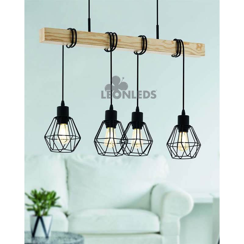 Hängende Deckenlampe der Townshend 5 Kollektion aus Holz und Stahl von Eglo Iluminación. Sie hat 4 hängende und hohle schwarze Stahl-Lampenschirme, die die Form von Dreiecken und Trapezen haben. Diese Schirme haben 4 Fassungen für die Platzierung von E27-Glühbirnen (nicht enthalten). Wir empfehlen die Verwendung von globusförmigen LED-Glühbirnen, um den Vintage-Stil dieser Lampe zu verstärken.