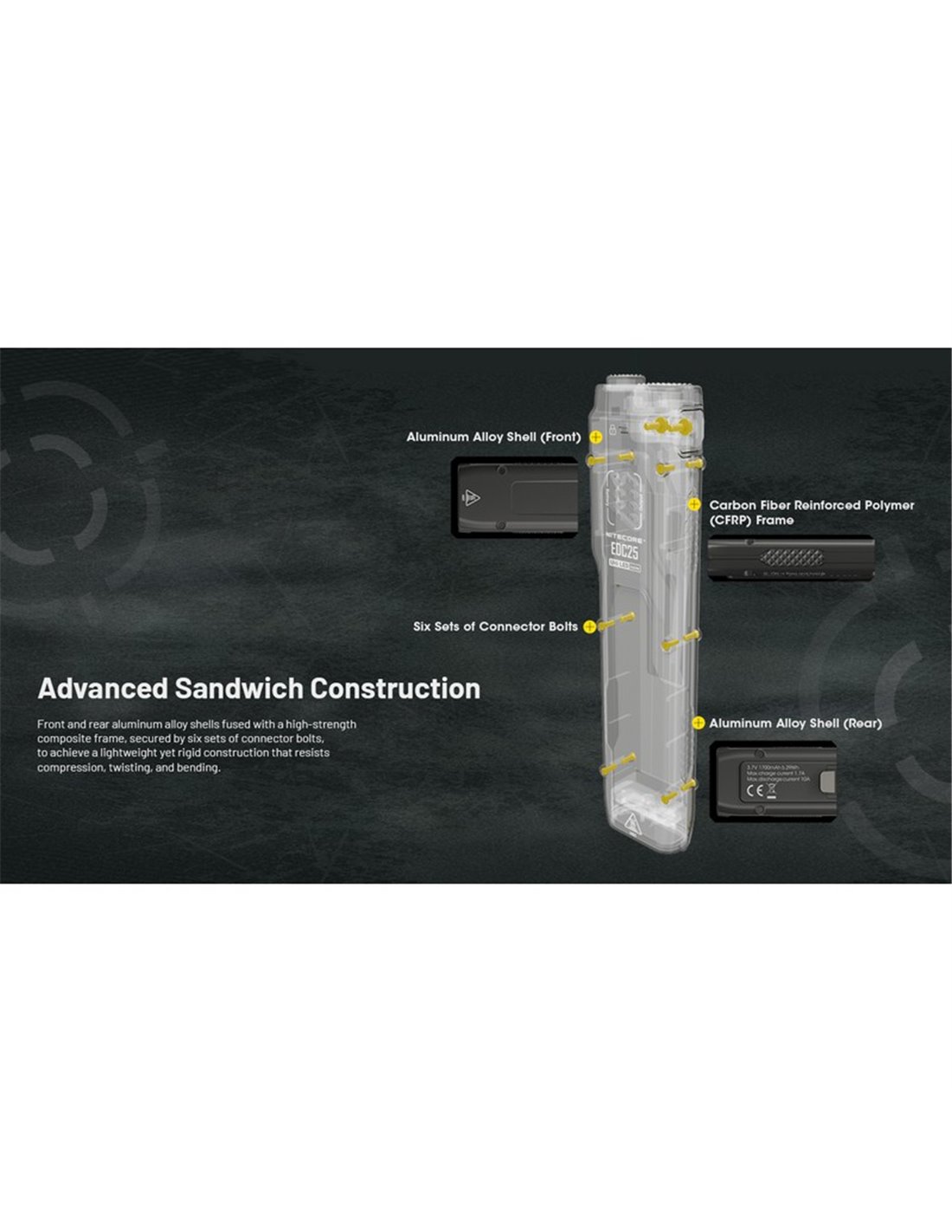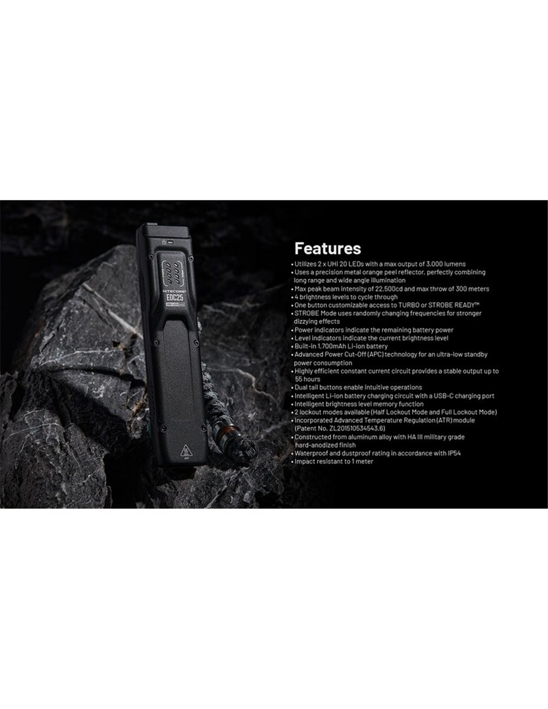 Die Handlampe NITECORE EDC25 bietet 3000 Lumen mit einer Reichweite von 300 Metern. Ultraleicht und kompakt, verfügt sie über eine 1700 mAh Batterie, USB-C Ladeanschluss und Zertifizierung IP54, ideal für taktische und tägliche Anwendungen mit schnellem Zugriff auf TURBO und STROBE.