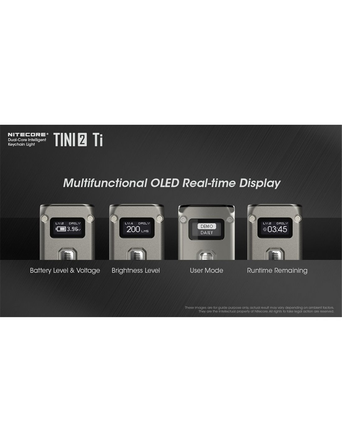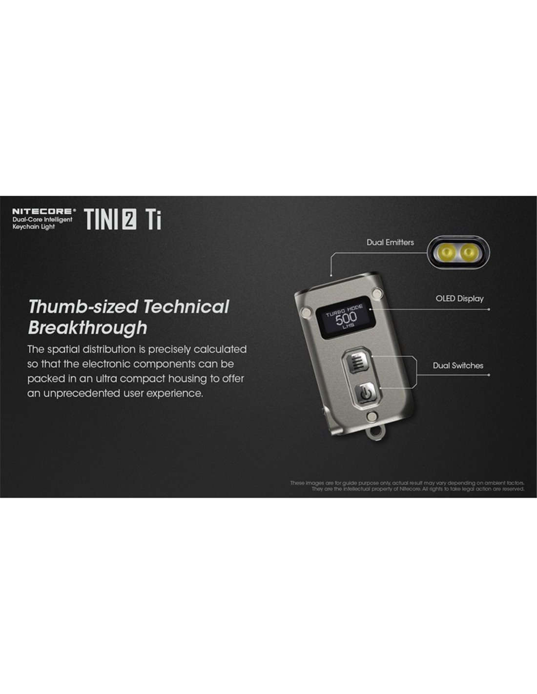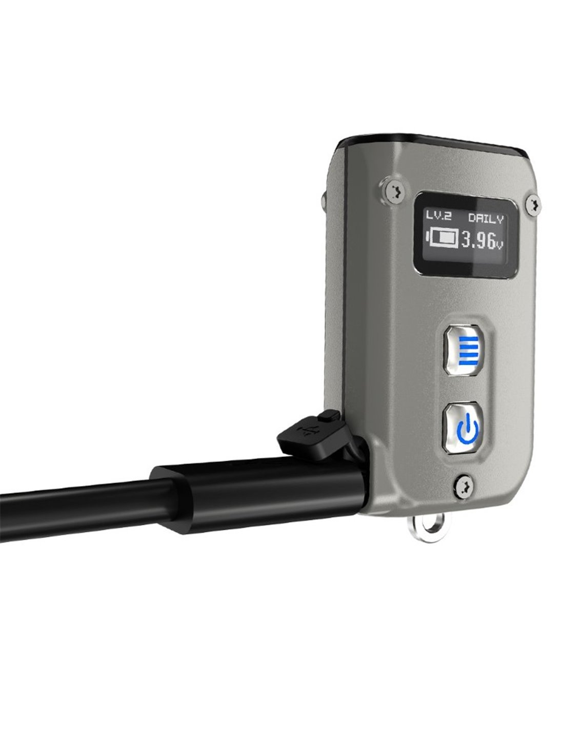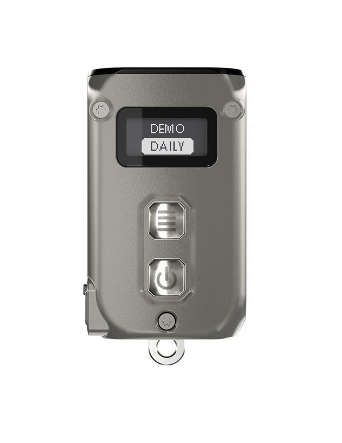 Tini2 SS TI Titanio Handlampe, mit einer maximalen Leistung von 500 Lumen und einer Reichweite von bis zu 89 Metern. Wiederaufladbar über USB-C, ideal als Schlüsselanhänger-Zubehör. Robust und kompakt mit OLED-Display.