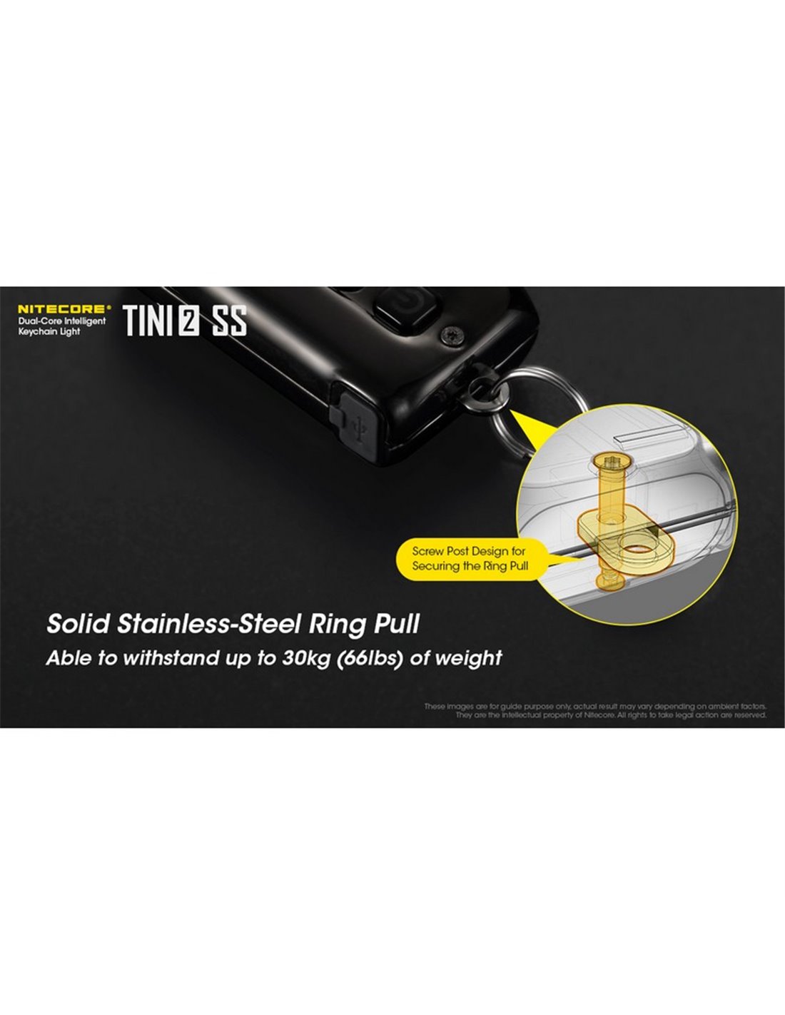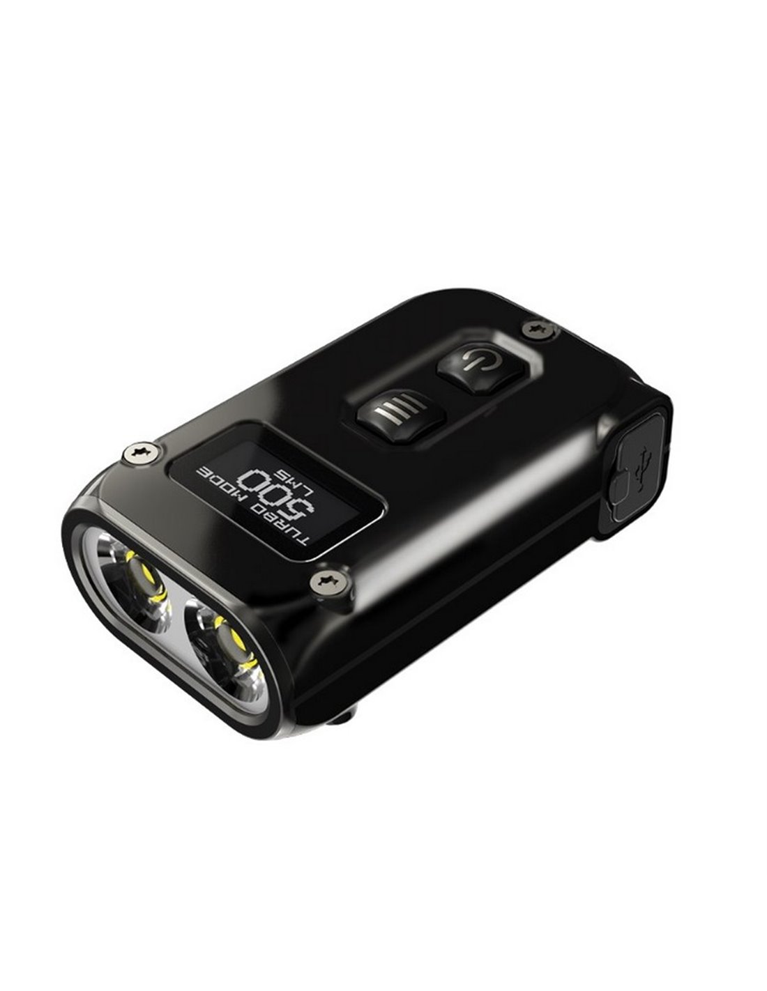 Tini2 SS Handlampe, kompakt und robust, mit einer Reichweite von bis zu 89 Metern und einer Leistung von 500 Lumen. Über USB-C wiederaufladbar, ideal als Schlüsselanhänger-Zubehör. Stoß- und wasserfest.