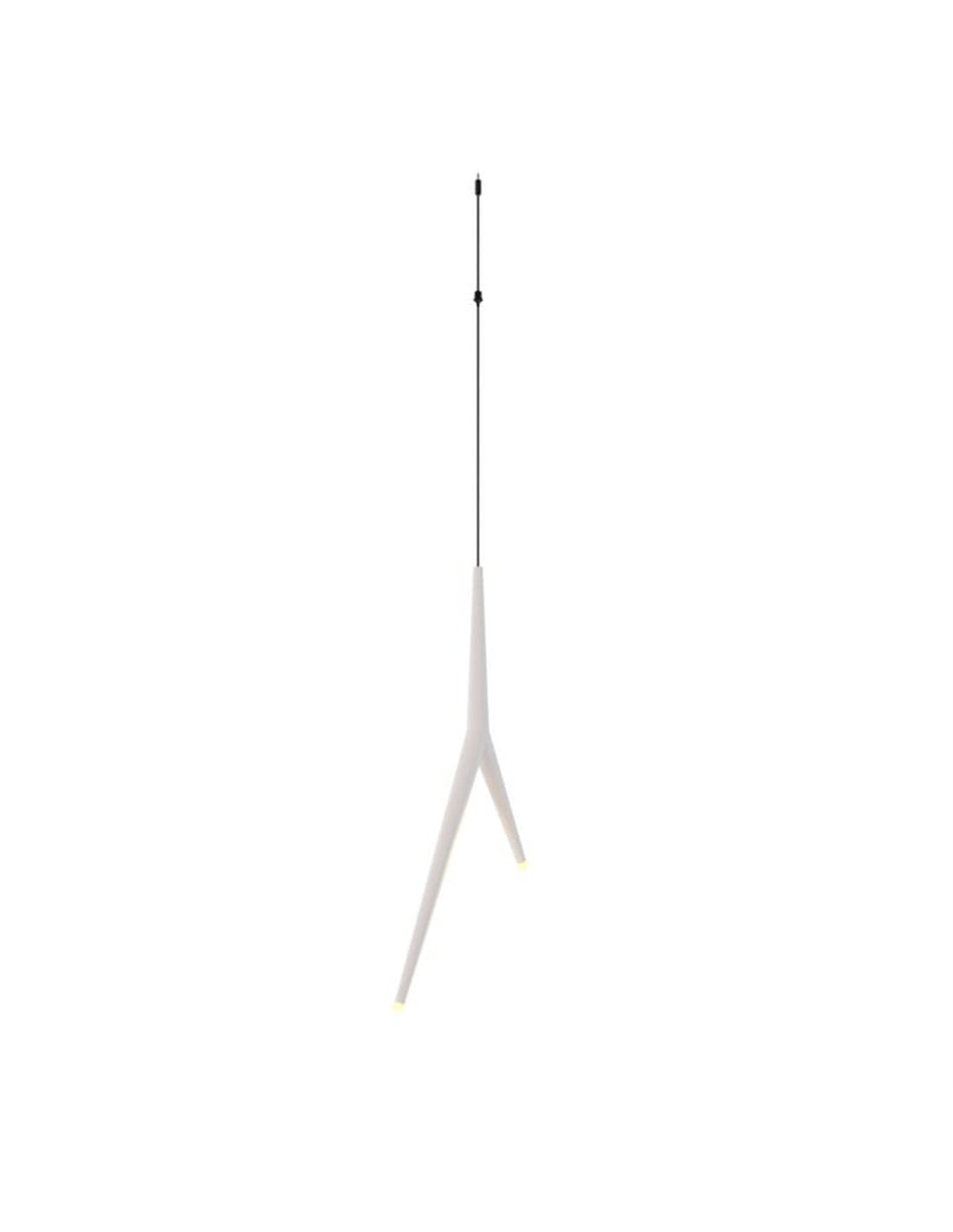 Die weiße ARRECIFE LED-Hängelampe des MODULAR LIGHT Systems von Mantra zeichnet sich durch ihren schlanken, dreibeinigen Körper und ihre 2 LED-Lichtpunkte an den unteren Enden aus.