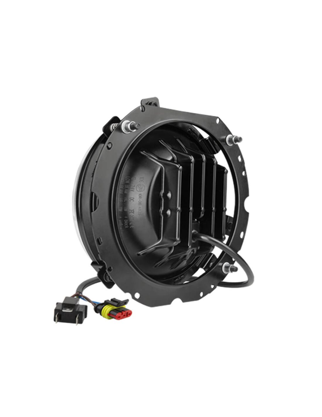 Vorgeschriebener Full LED Frontscheinwerfer mit 7" Funktionen, um eingebaut in der Front eines beliebigen Fahrzeugs mit einem 7-Zoll-Scheinwerfer installiert zu werden, geeignet für 12V und 24V, beinhaltet 4 Funktionen: Standlicht, Abblendlicht, Fernlicht und Tagfahrlicht DRL, Modell Full LED Scheinwerfer. Zum Anschluss sind 0,3 Meter Kabel enthalten. Kann sowohl auf der rechten als auch auf der linken Seite installiert werden, ist händisch unauffällig.
