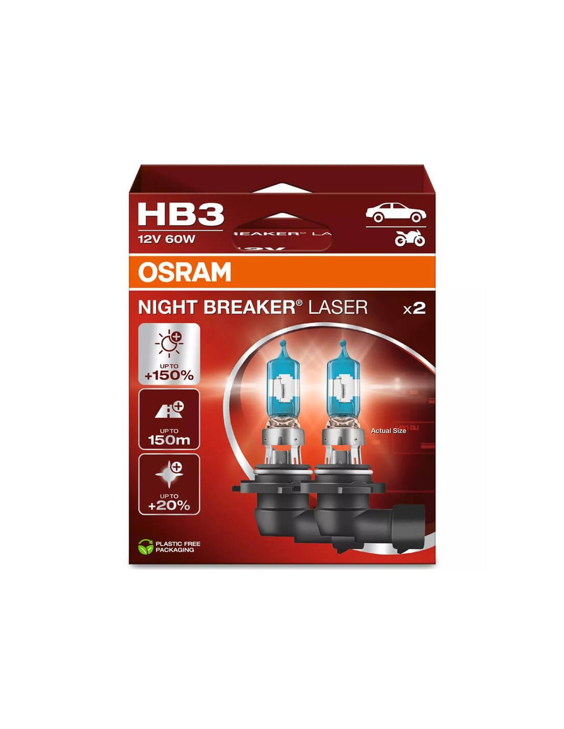 Die Osram HB3 Night Breaker Laser GEN2 Glühbirnen gehören zu den leistungsstärksten Halogenlampen auf dem Markt und bieten bis zu 150 % mehr Licht als eine herkömmliche Glühbirne, mit einem weißeren Licht als eine herkömmliche Lampe. Diese Lampe bietet eine längere Lebensdauer von bis zu 210 Stunden Betriebszeit. Es ist die perfekte Reihe in Bezug auf Preis-Leistungs-Verhältnis, wenn du mehr Lichtleistung als mit herkömmlichen Glühbirnen suchst.