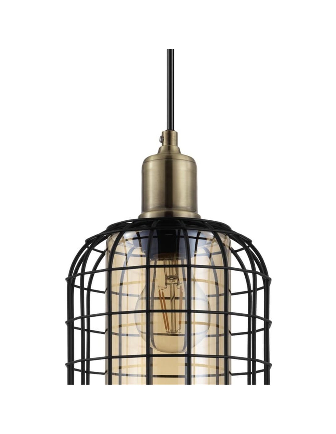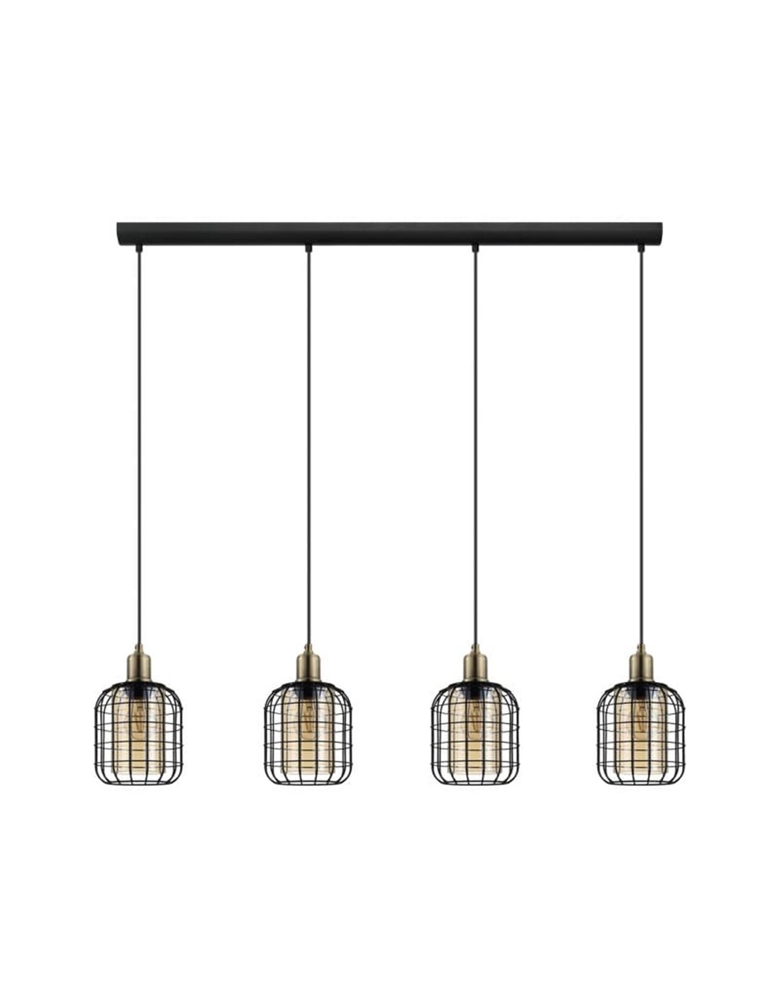 Hängeleuchte CHISLE von Eglo, mit vier schwarzen Drahtkörben und Körpern aus bernsteinfarbenem Glas, die in unterschiedlichen Höhen von einem schwarzen Metallgehäuse hängen. Kompatibel mit E27-Glühlampen (nicht enthalten). Perfekt zum Beleuchten großer Räume mit einem modernen und rustikalen Stil.