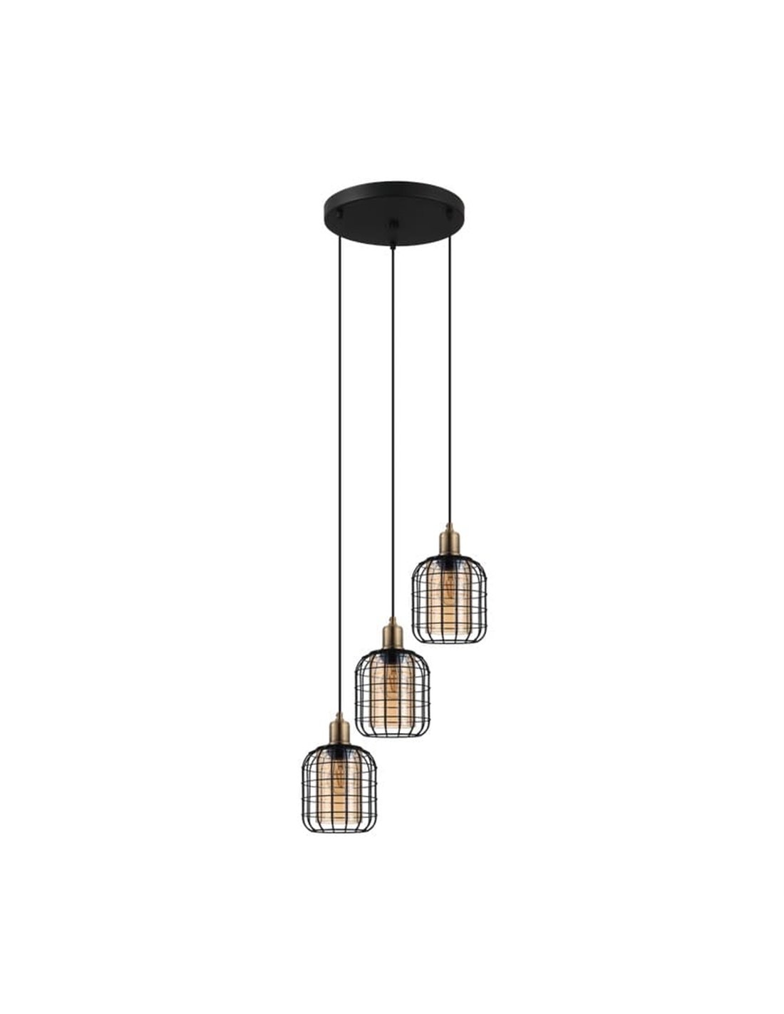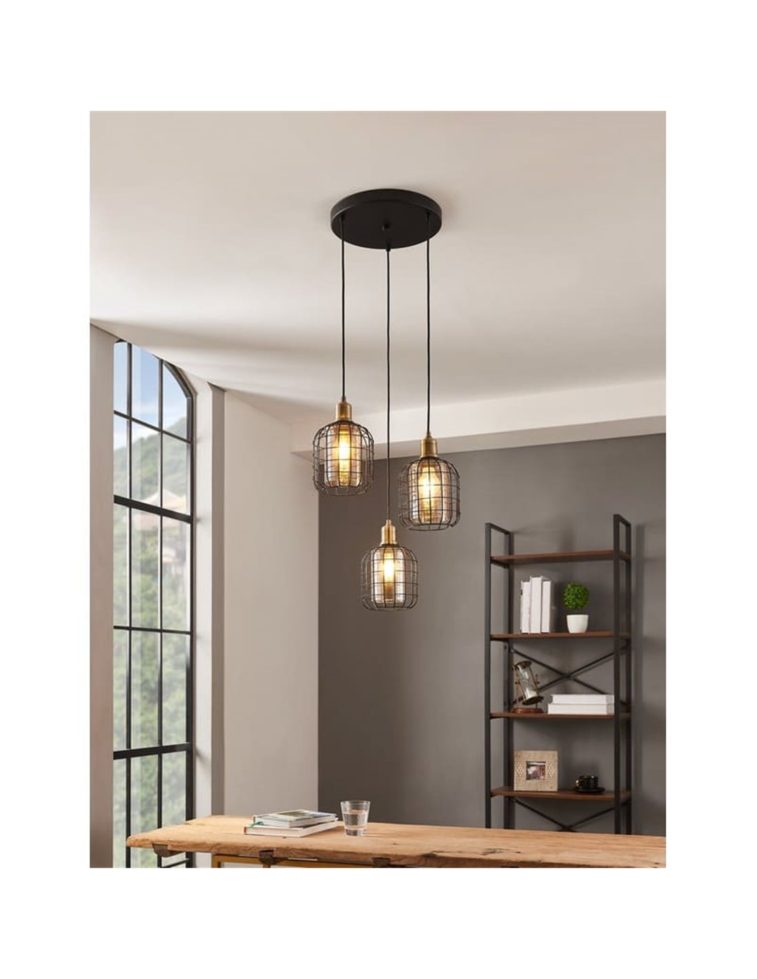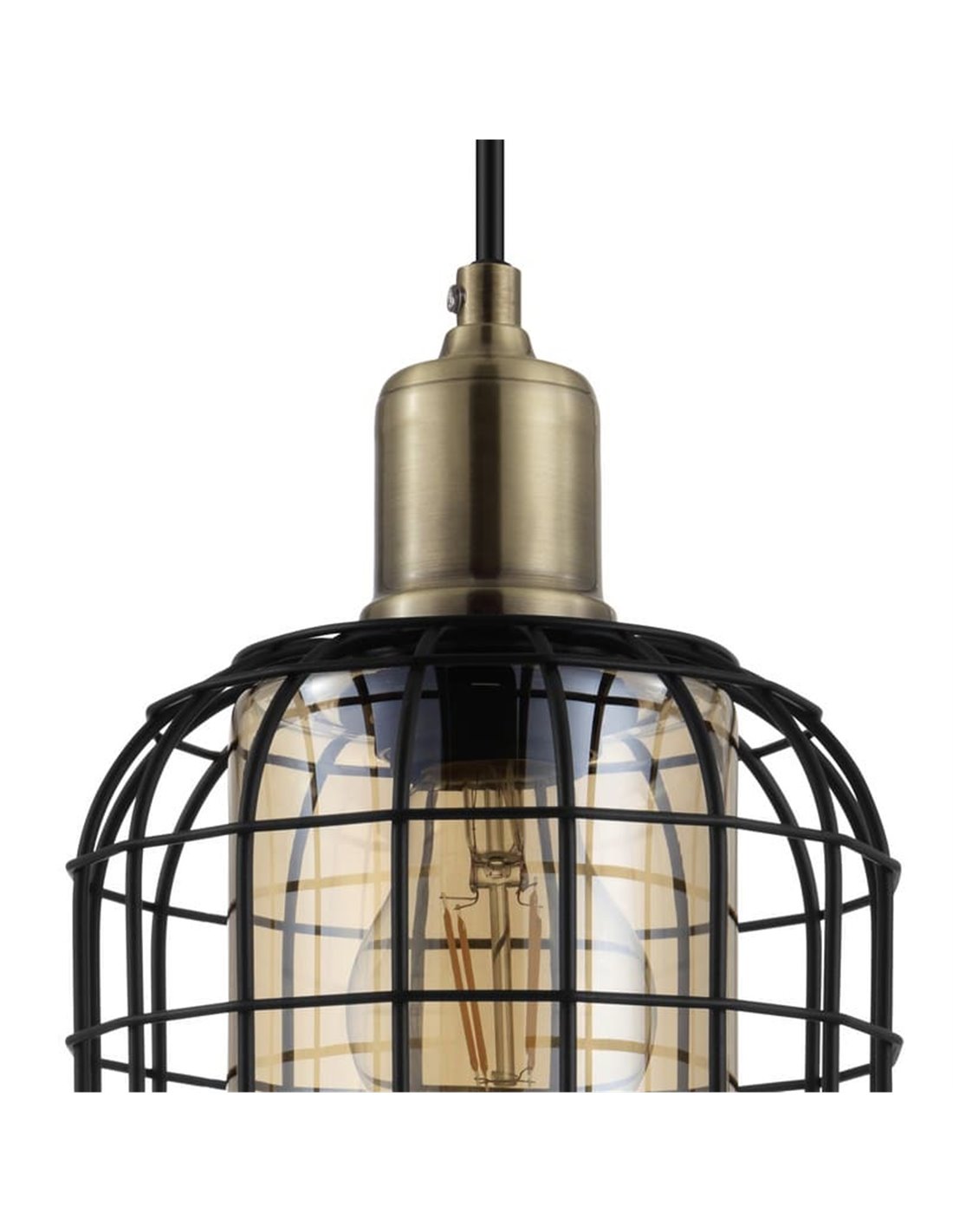 Hängeleuchte CHISLE von Eglo, mit drei schwarzen Drahtkörben und Körpern aus bernsteinfarbenem Glas, die in unterschiedlichen Höhen von einem schwarzen Metallgehäuse hängen. Kompatibel mit E27-Glühlampen (nicht enthalten). Ideal zum Beleuchten von Wohnzimmern und Esszimmern mit einem modernen und rustikalen Stil.