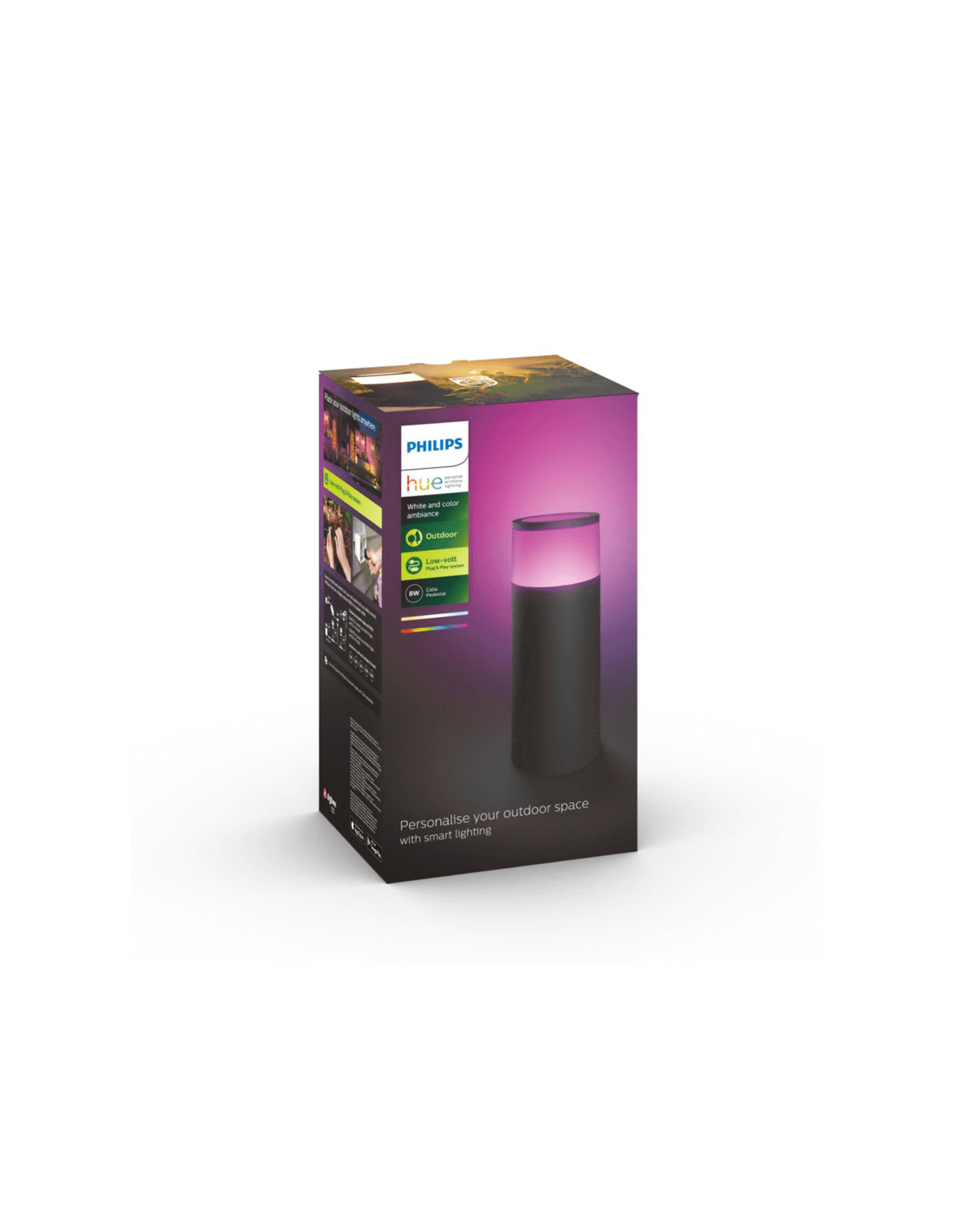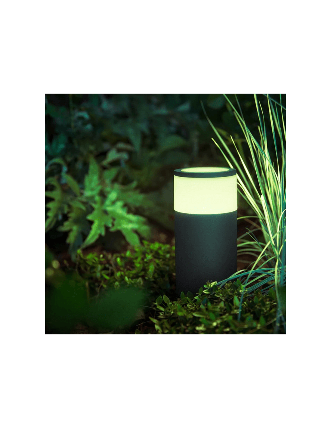 Dieser Sockel für den Außenbereich, Modell Calla, ist perfekt, um mit einem Knopfdruck Atmosphäre in Gärten und auf Terrassen (IP65) zu schaffen. Er besteht aus Aluminium mit schwarzem Finish. Reguliere die perfekte Beleuchtung für jeden Anlass mit der Hue-App und dem Schalter.