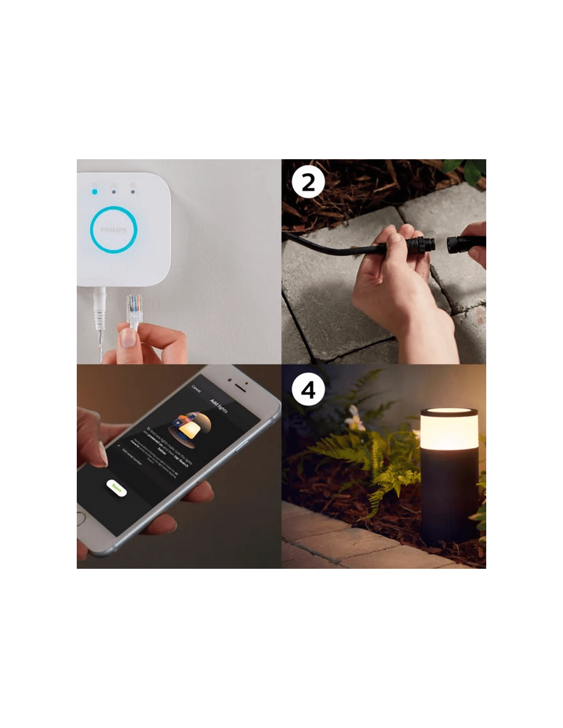 Jede Philips Hue Außenbeleuchtung benötigt eine spezifische Stromversorgung, um korrekt zu funktionieren. Diese Energie wird durch einen Transformator (Netzteil) bereitgestellt, der den elektrischen Strom in die geeignete Leistung für die Beleuchtung umwandelt.