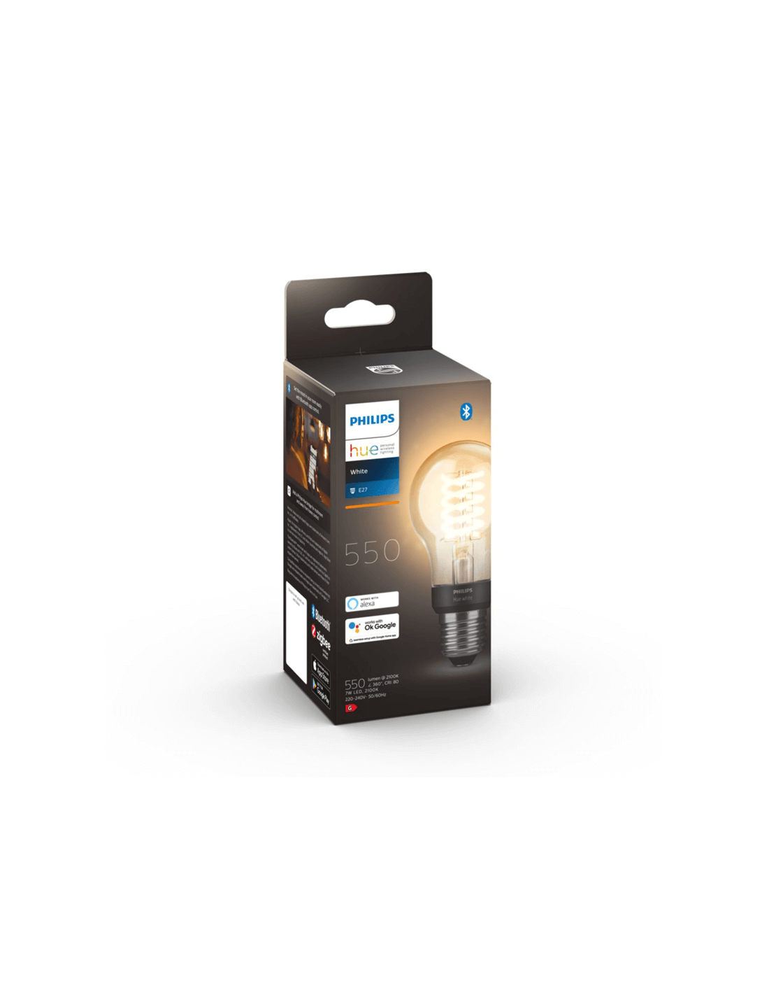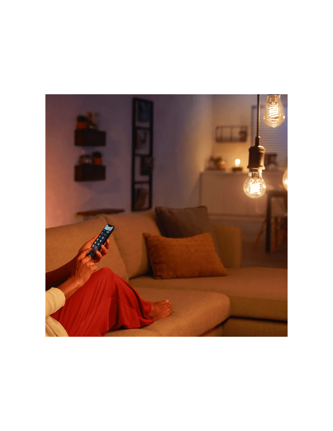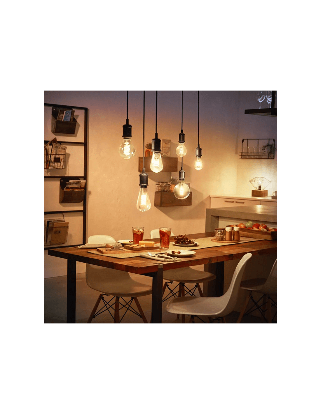 Diese Vintage-Design-Glühbirne ist über die Hue-App und den Schalter dimmbar. Sie bietet eine Farbtemperatur von 2.100K mit 550 Lumen (sanftes weißes Licht) und einem Verbrauch von 7W maximaler Leistung.