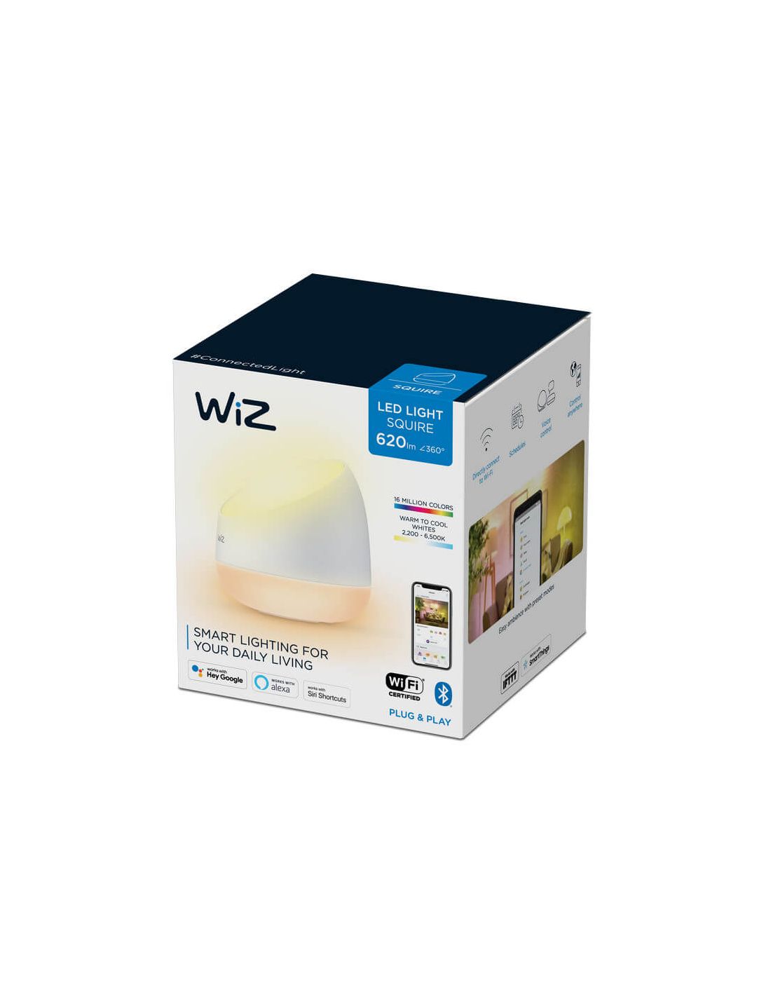 Das einzigartige Design dieser WiZ-Lampe ermöglicht es, Lichtakzente an der Wand zu setzen, während es sanft auf der Oberfläche strahlt, wo die Squire Tischlampe platziert ist. Wage es, aus unzähligen Millionen von Lichtfarben zu kombinieren, oder wähle dynamische Lichtmodi, um Szenen zu schaffen, die sich deiner Stimmung anpassen, dank einer Leistung von 9W mit einer Farbtemperatur von 2200-6500K (RGB) und einem Lichtstrom von 620 Lumen.
