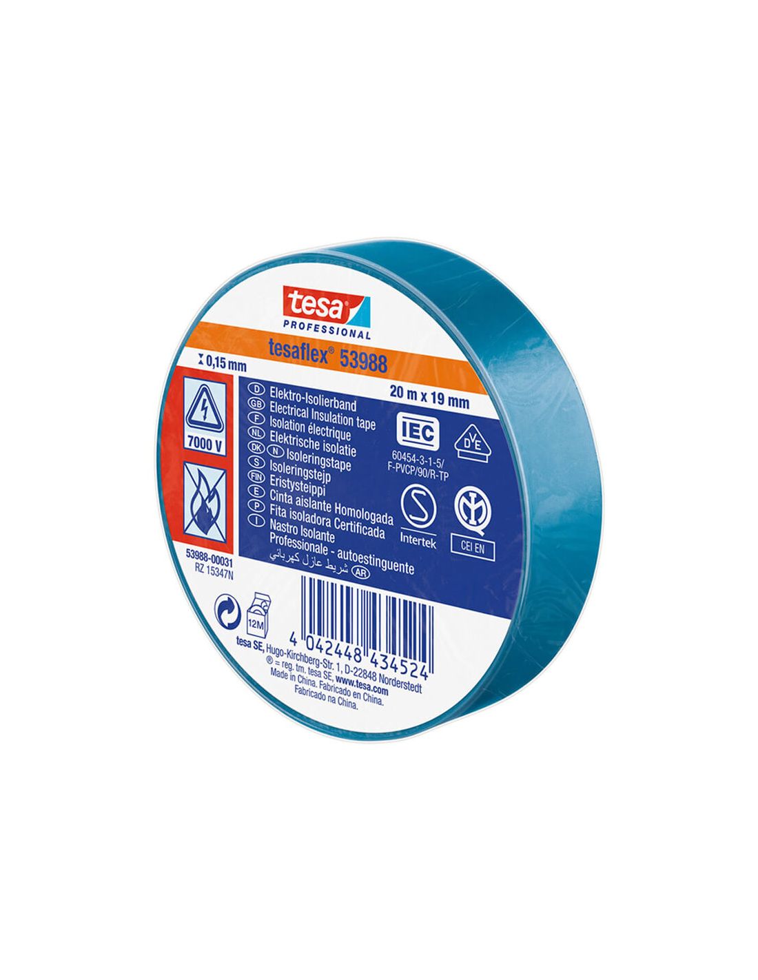 Tesa Professional 53988 blaue Isolierband, Maß 19mm x 20m, mit dielektischer Festigkeit von 7000V und thermischer Beständigkeit von bis zu +90°C. Ideal zum Isolieren und Markieren von Kabeln mit professionellem Finish.