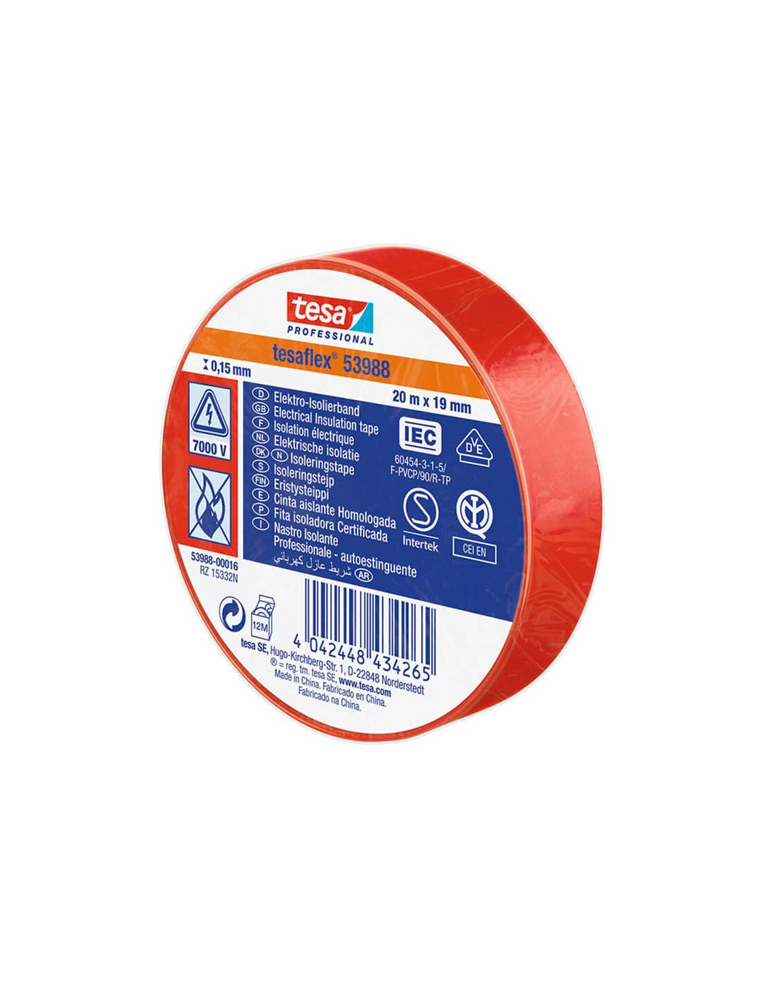 Tesa Professional 53988 rote Isolierband von 19mm x 20m, IEC 60454-3-1 zertifiziert, mit dielektischer Festigkeit von 7000V, einer Dicke von 150 μm und einem hoch haftenden Kleber. Ideal zum Isolieren und Kennzeichnen von Kabeln.