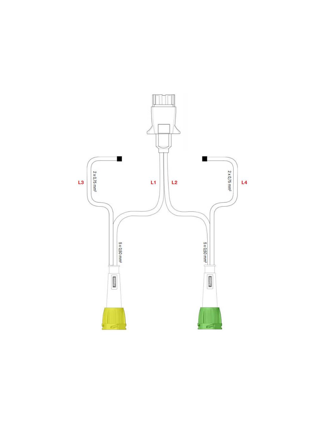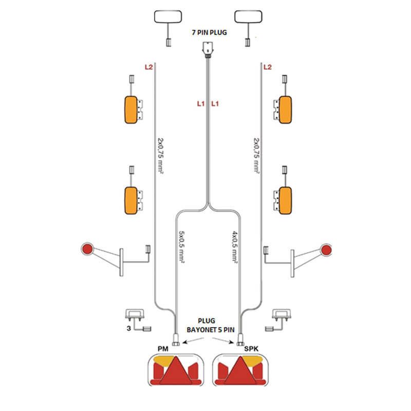 Anhängerverkabelung mit 7-poligem Stecker und 2 Bajonettsteckern mit 5 Polen zum Anschließen der Rücklichter LED, die über diesen Steckertyp verfügen. Sie enthält auch Seitenverkabelungen zum Installieren seitlicher Galia-Beleuchtung. Ideal zur schnellen und einfachen Ersetzung der Rücklichter und der Verkabelung, erfordert fast keine Installation. Sie besteht aus zwei 4 und 5-aadrigen Kabeln von 0,5mm2, was eine individuelle Installation bis zur Rückseite ermöglicht, (die LED-Piloten sind nicht enthalten), geeignet für 12-Volt-Installationen. Sie enthält auch rechteckige Verdrahtung von 2x0,75mm2 zum Installieren vorderer und seitlicher Galia-Piloten.