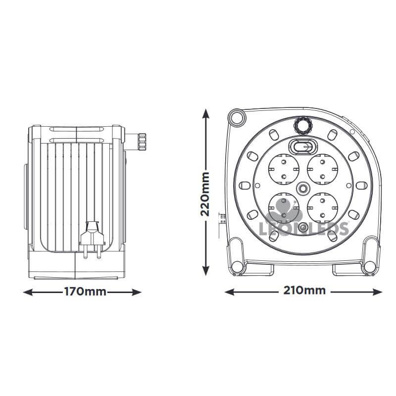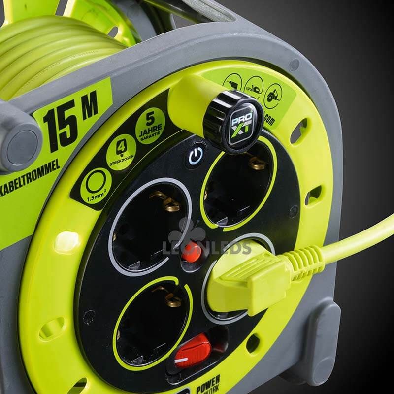 Der 15 Meter Kabelaufroller von ProXT ist ein perfektes Zubehör für jedes Zuhause oder jede Werkstatt. Er ist so konzipiert, dass er 15 Meter Kabel mit 3x1,5mm2 aufrollt. Das Gehäuse enthält 4 Steckdosen, einen ON/OFF-Schalter und einen Betriebsanzeiger. Auch ein Verlängerungshandgriff ist enthalten, um das Aufrollen des Kabels zu erleichtern.