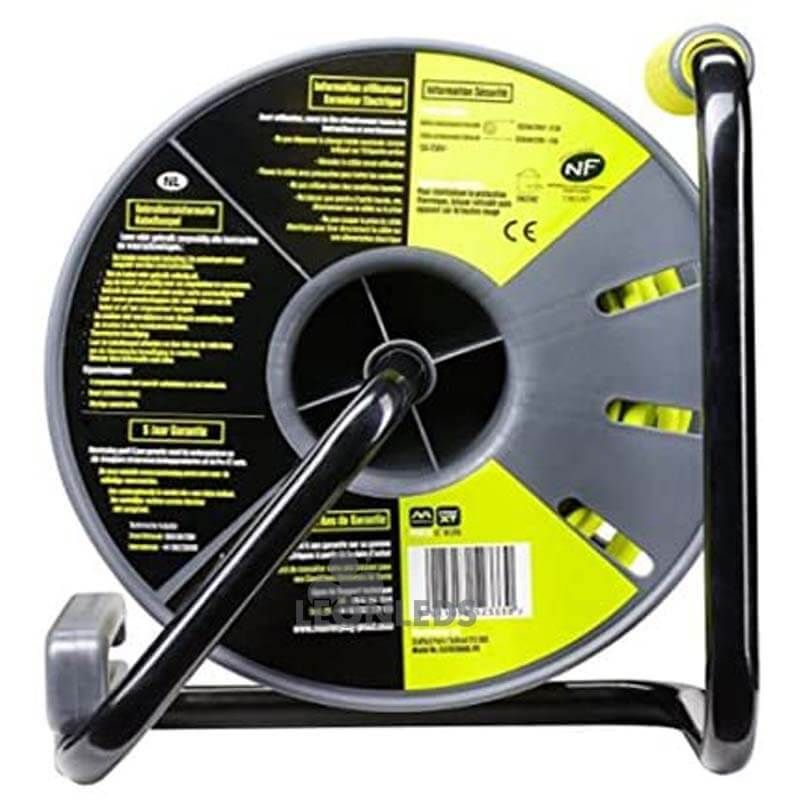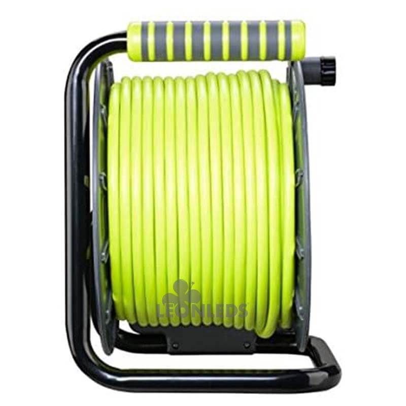 Kabeltrommel 50 Meter mit grünem Kabel für bessere Sichtbarkeit von 3x1.5m2, beinhaltet 4 Steckdosen, einen ON/OFF-Schalter und eine Betriebsanzeige, enthält ein Sicherheitsgerät Thermal Cut gegen Überhitzung und einen ausziehbaren Griff zum sicheren Aufrollen des Kabels.