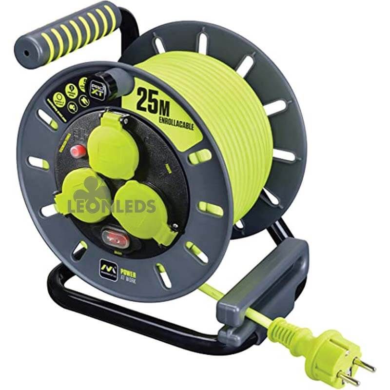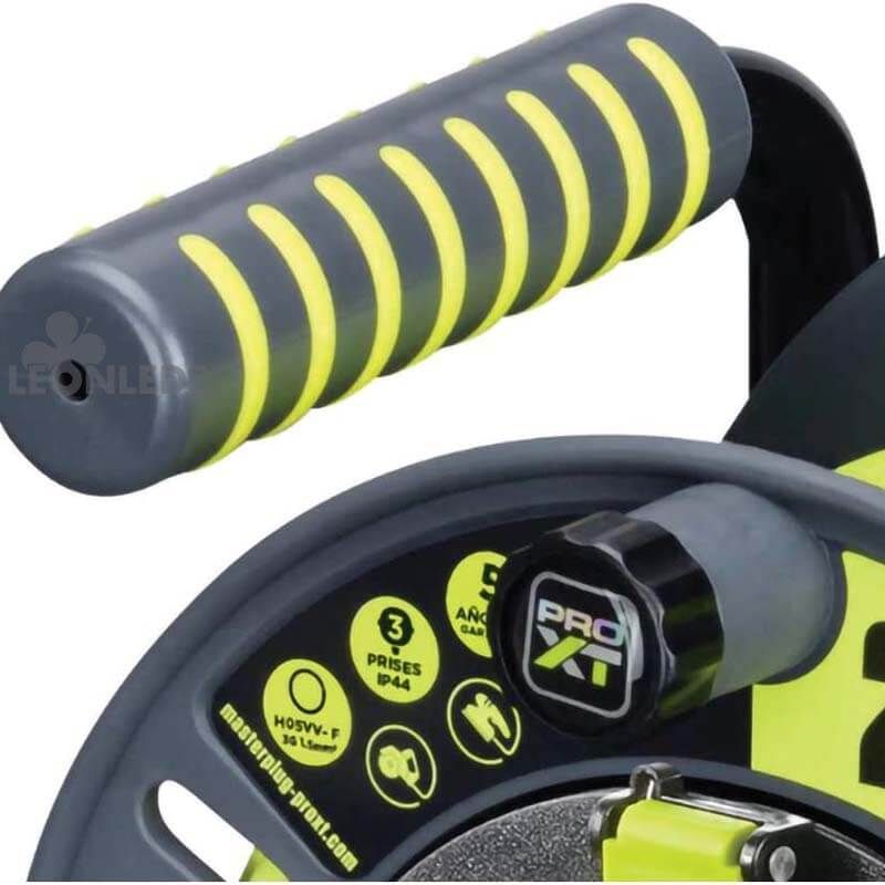 Die 25-Meter-IP44-Kabeltrommel von ProXT ist ein perfektes Zubehör für jedes Heim oder Werkstatt, sie ist dafür ausgelegt, 25 Meter Kabel von 3x1.5mm2 aufzuwickeln. Das Gehäuse umfasst 3 Steckdosen mit Abdeckung, einen ON/OFF-Schalter und eine Betriebsanzeige, beide geschützt, um Schäden durch Feuchtigkeit oder Wasser in der Umgebung zu vermeiden. Es enthält auch eine Kabelführung und einen abnehmbaren Griff, um das Kabel leichter aufzuwickeln.
