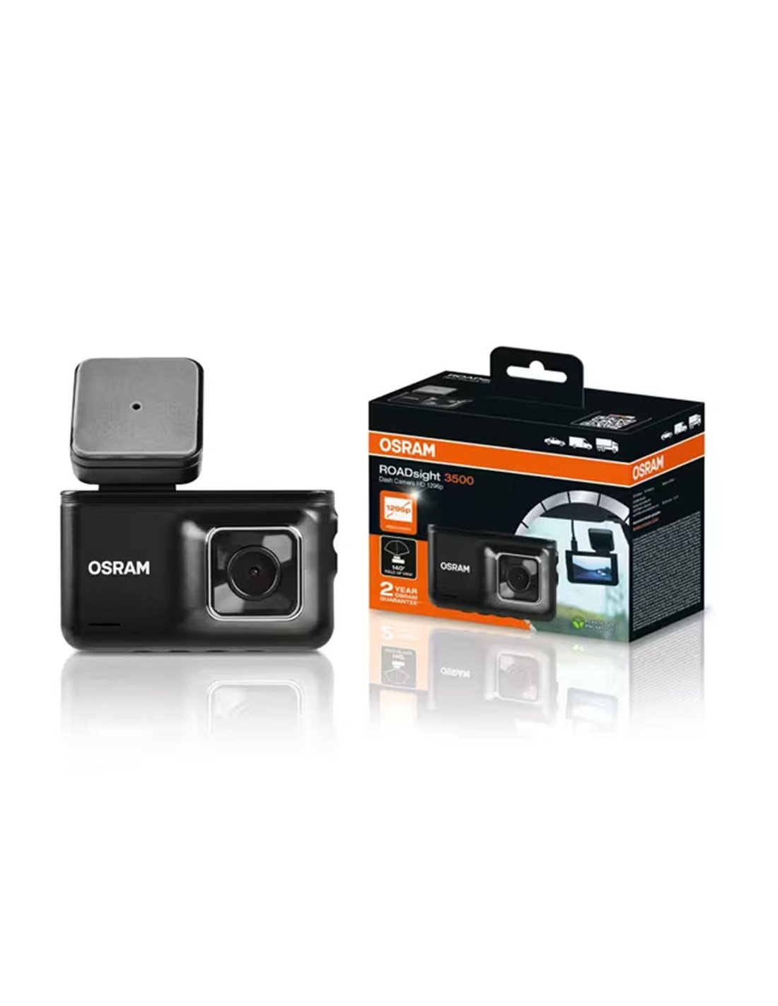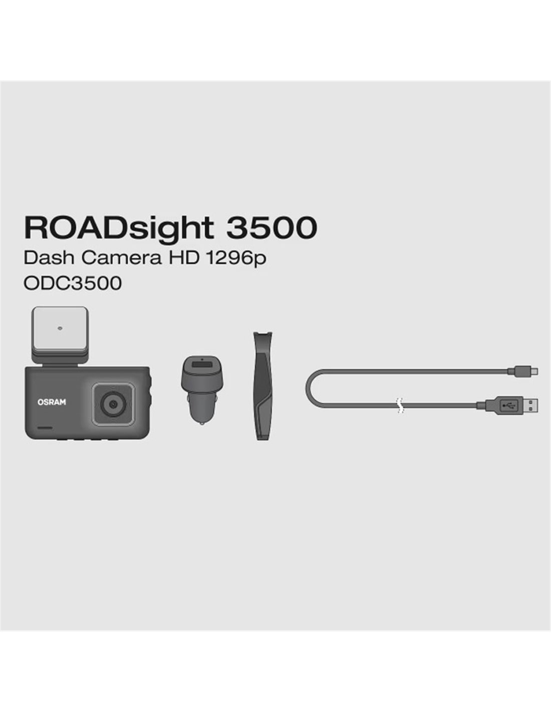Dashcam OSRAM ROADsight 3500 mit Video 1296p bei 30 fps, Weitwinkel 140° und 3" IPS Bildschirm für klare Sicht und Einstellungen. Enthält integriertes GPS zur Dokumentation von Route und Geschwindigkeit, HDR für Szenen mit hohem Kontrast, G-Sensor mit automatischer Datei-Sperrfunktion und PARKMODUS (Clip bis zu 30 s). Kompatibel mit 12/24 V, Stromversorgung USB-C, 3M Kleber für eine saubere Montage und microSD bis zu 128 GB. Inklusive Demontagewerkzeug für professionelles Kabelverlegen.