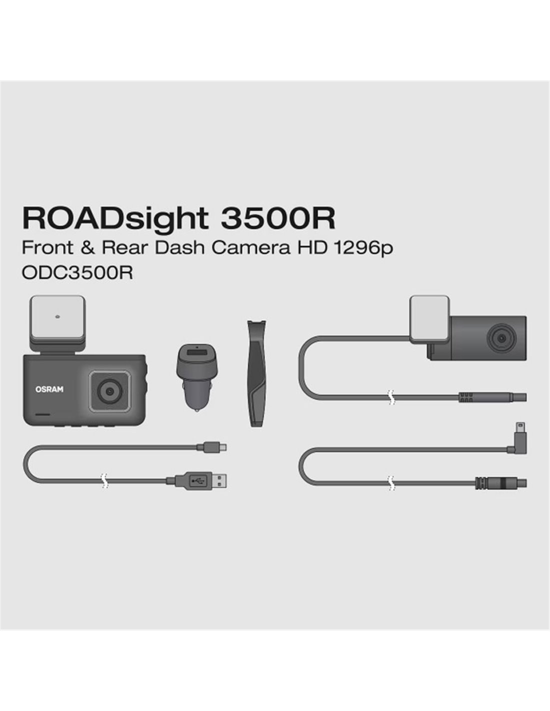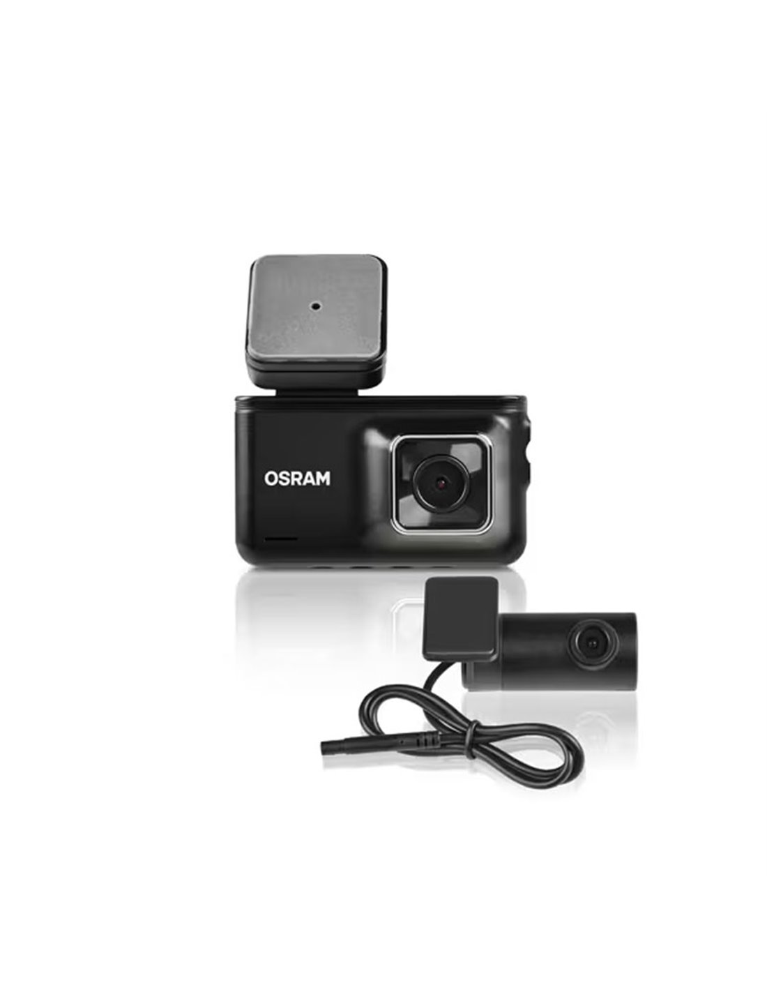 Kamera Kit (vorne und hinten): Dash cam OSRAM ROADsight 3500R mit Frontaufnahme 1296p bei 30 fps und Weitwinkel 140°, sowie Rückkamera (120°) für vollständige Abdeckung des Fahrzeugs. Enthält integriertes GPS für Route und Geschwindigkeit, HDR zur Verbesserung von Szenen mit hohem Kontrast, G-Sensor mit automatischer Sperrfunktion und PARKMODUS (Clips bis 30 s). 3" IPS Bildschirm (nicht berührungsempfindlich), Stromversorgung 12/24 V über USB-C, Speicherung auf microSD bis zu 128 GB mit 3M Kleber für eine saubere Montage und Demontagewerkzeug. Die Rückkamera nimmt in Full HD auf, ideal zur Dokumentation von Auffahrunfällen und Manövern.