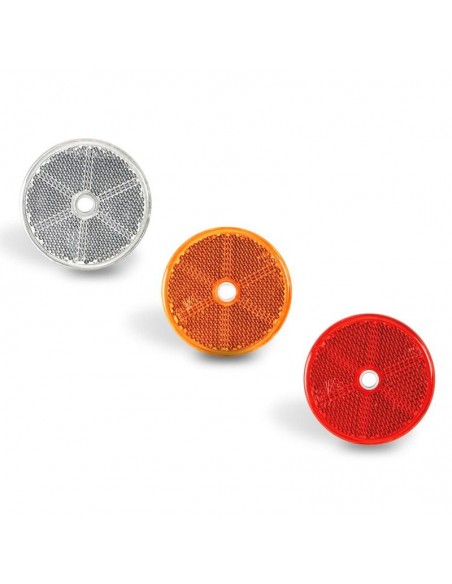 Runder Katadioptriker für Lastwagen und Anhänger mit Loch zur Installation durch Niete oder Schraube mit einem Durchmesser von 6Cm, einer Dicke von 5,5Cm und mit homologationscode, der in den eigenen Reflektor eingraviert ist. Du kannst diesen runden Katadioptriker in Weiß für die Vorderseite, Bernstein für die Seite und Rot für die Rückseite wählen.