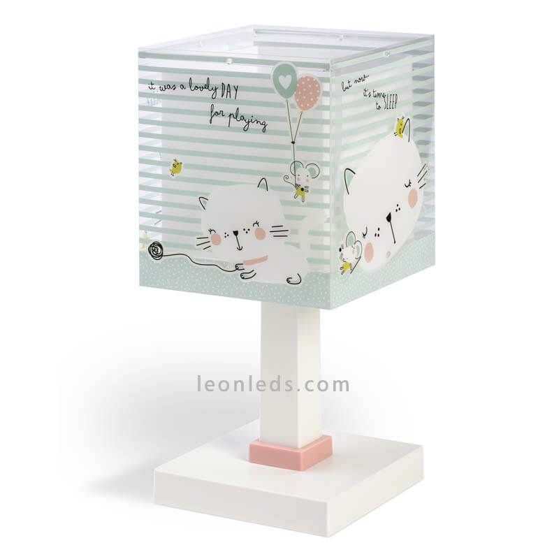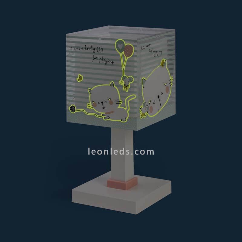 Tischlampe aus der neuen Serie von Dalber, Loving Cat, bietet ein sehr originelles Kindendesign. Die Struktur dieser Lampe ist weiß mit einem rosa Detail an der Verbindung von Basis und Körper, der Schirm ist quadratisch dekoriert mit grünen Linien, Sprüchen, Katzen und Mäusen. Der Umriss der Tiere leuchtet im Dunkeln.