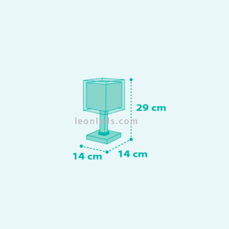 Diese Kindertischlampe ist quadratisch und hat eine Höhe von 29 cm, eine Länge von 14 cm und eine Breite von 14 cm.