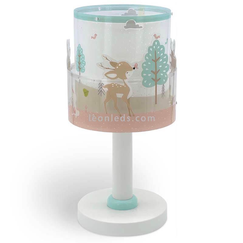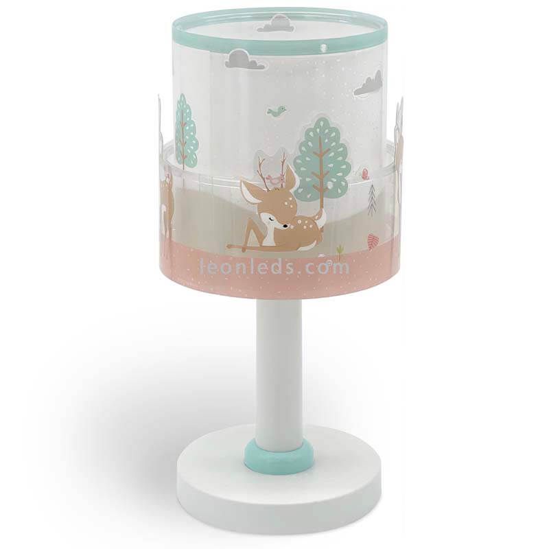 Die Kindertischlampe der Loving Deer Kollektion von Dalber. Sie ist mit einem doppelten transparenten Schirm und runder Form in Pastellfarben gefertigt und ziert mit Zeichnungen von Rehen und anderen Tieren im Wald.