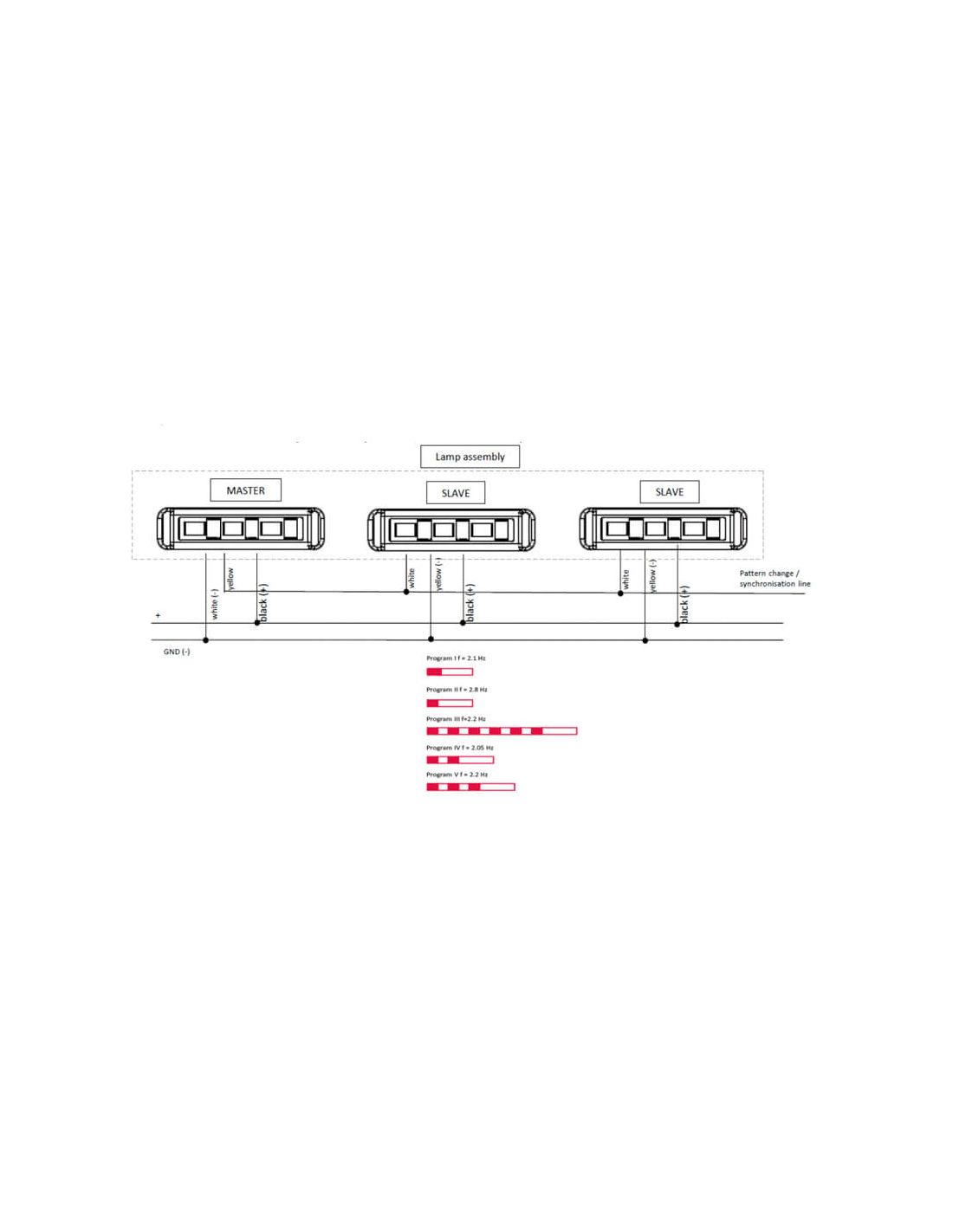 Jede Lampe verfügt über 5 programmierbare Blitzmuster, die einfach durch Anschluss des Synchronisationskabels an die Masse (-) konfiguriert werden können.