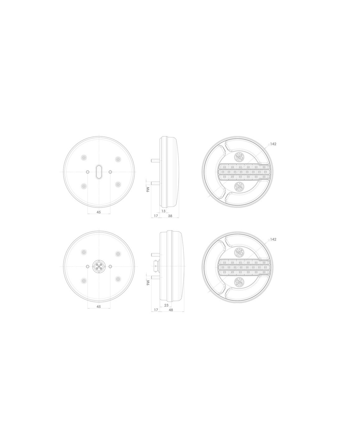 Das neue Kit mit runden LED-Rückleuchten W153 und W154 DD zeichnet sich durch sein innovatives Design und sein charakteristisches Aussehen aus. Dieses Kit besteht aus 6 runden LED-Rückleuchten, 4 davon mit 3 Funktionen (Position, Bremslicht und Blinker) und die anderen 2 LED-Rückleuchten mit 3 Funktionen, darunter Rückwärtsfahrt, Nebel (2 Hochleistungs-LEDs) und Position.