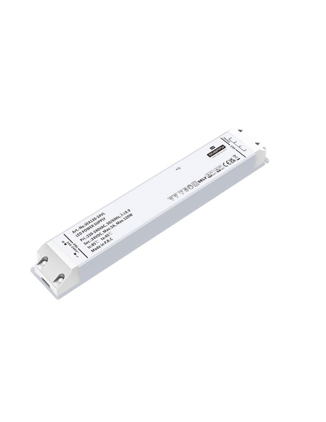 Konstantspannungstreiber IP20 24VDC -120W (SEA120-24VL) in Schwarz, entworfen, um LED-Streifen mit 24VDC zu speisen. Ideal für Innenbeleuchtungsanwendungen, die eine höhere Leistung erfordern. Kompatibel mit Mantra-Produkten.