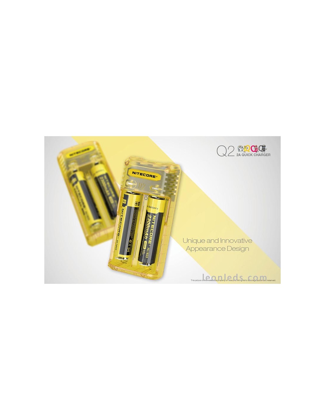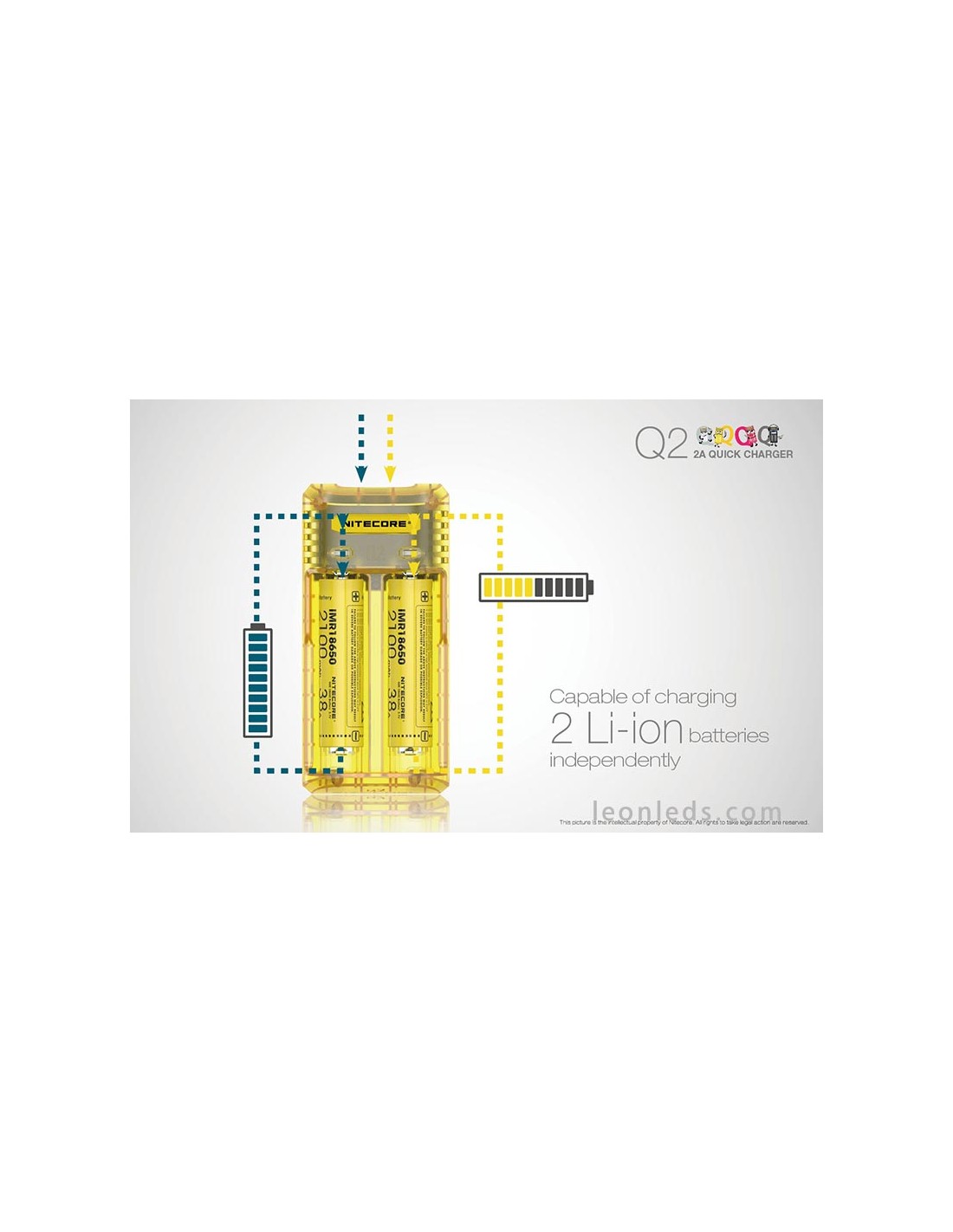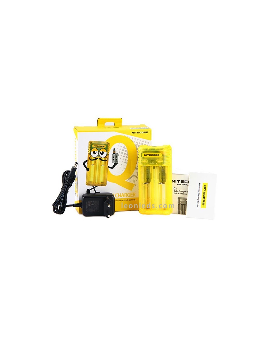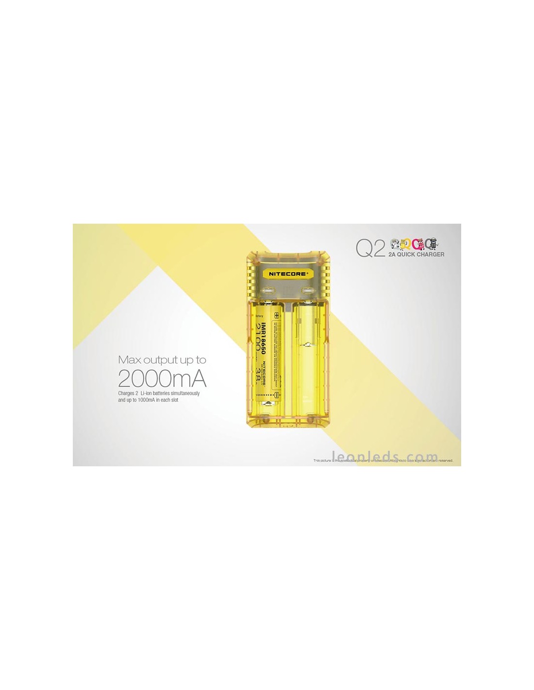 Ladegerät mit 2 Schacht von der Marke Nitecore Modell Q2 in Limongelb, ein Schnellladegerät mit bis zu 2 Ampere, ein revolutionäres Ladegerät für IMR-Batterien, das 2 Li-ion-Batterien gleichzeitig unabhängig laden kann. Ein Ladegerät, das für die Nutzung im Auto mit dem entsprechenden Adapter geeignet ist (nicht enthalten).