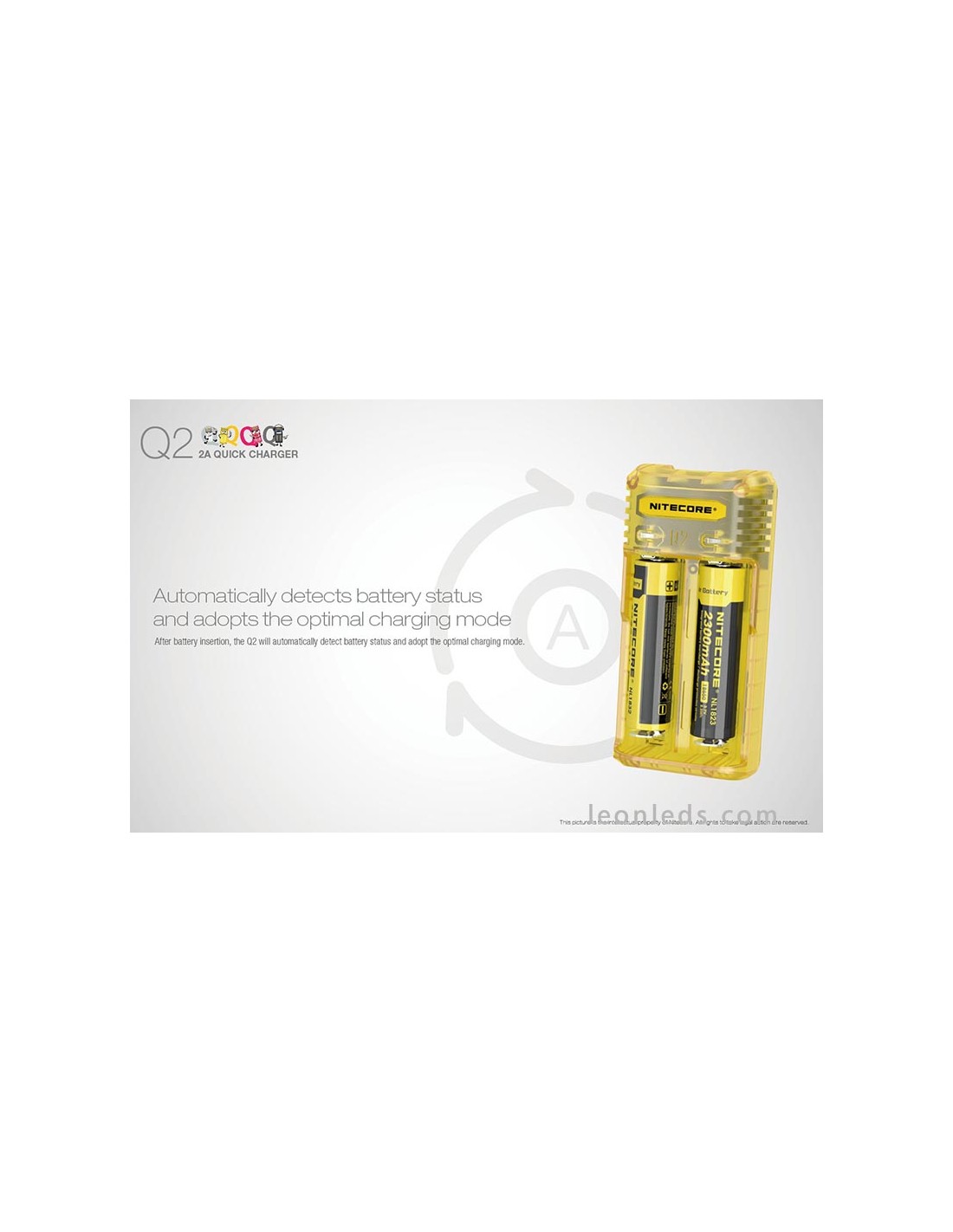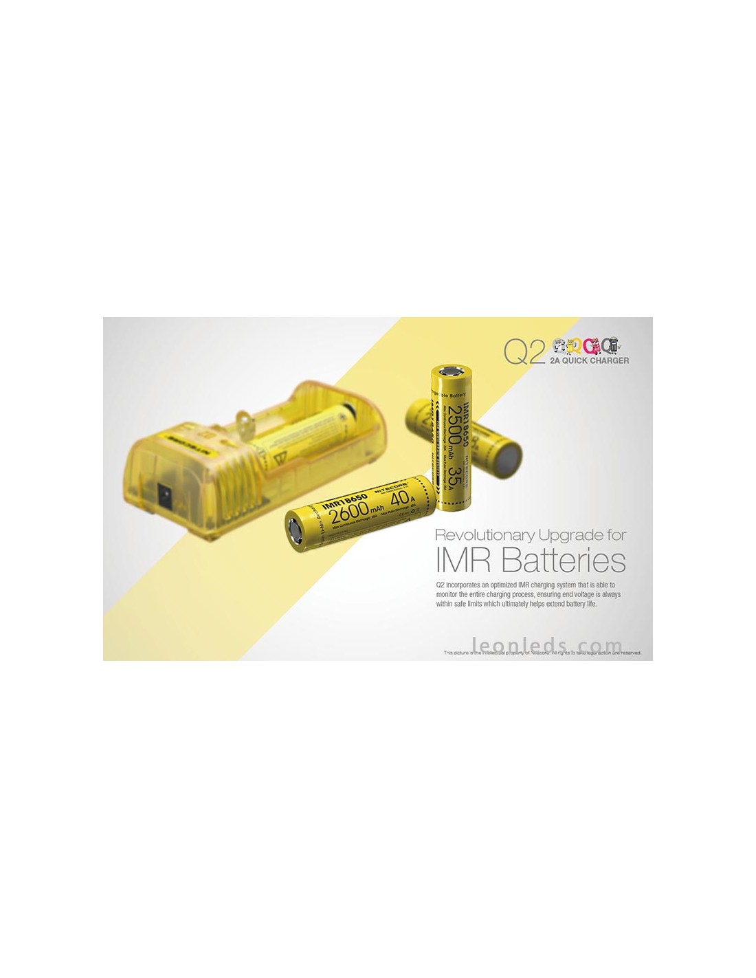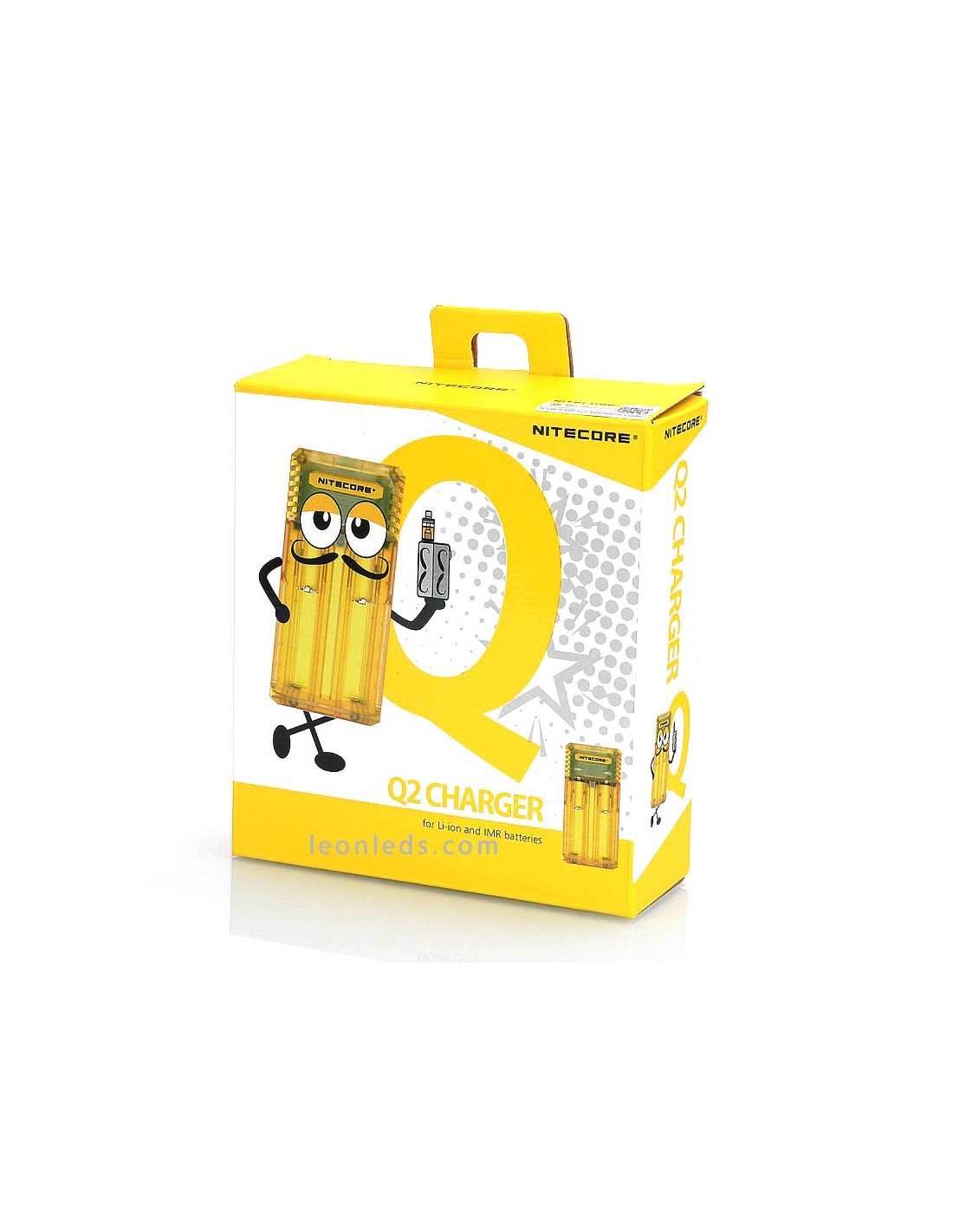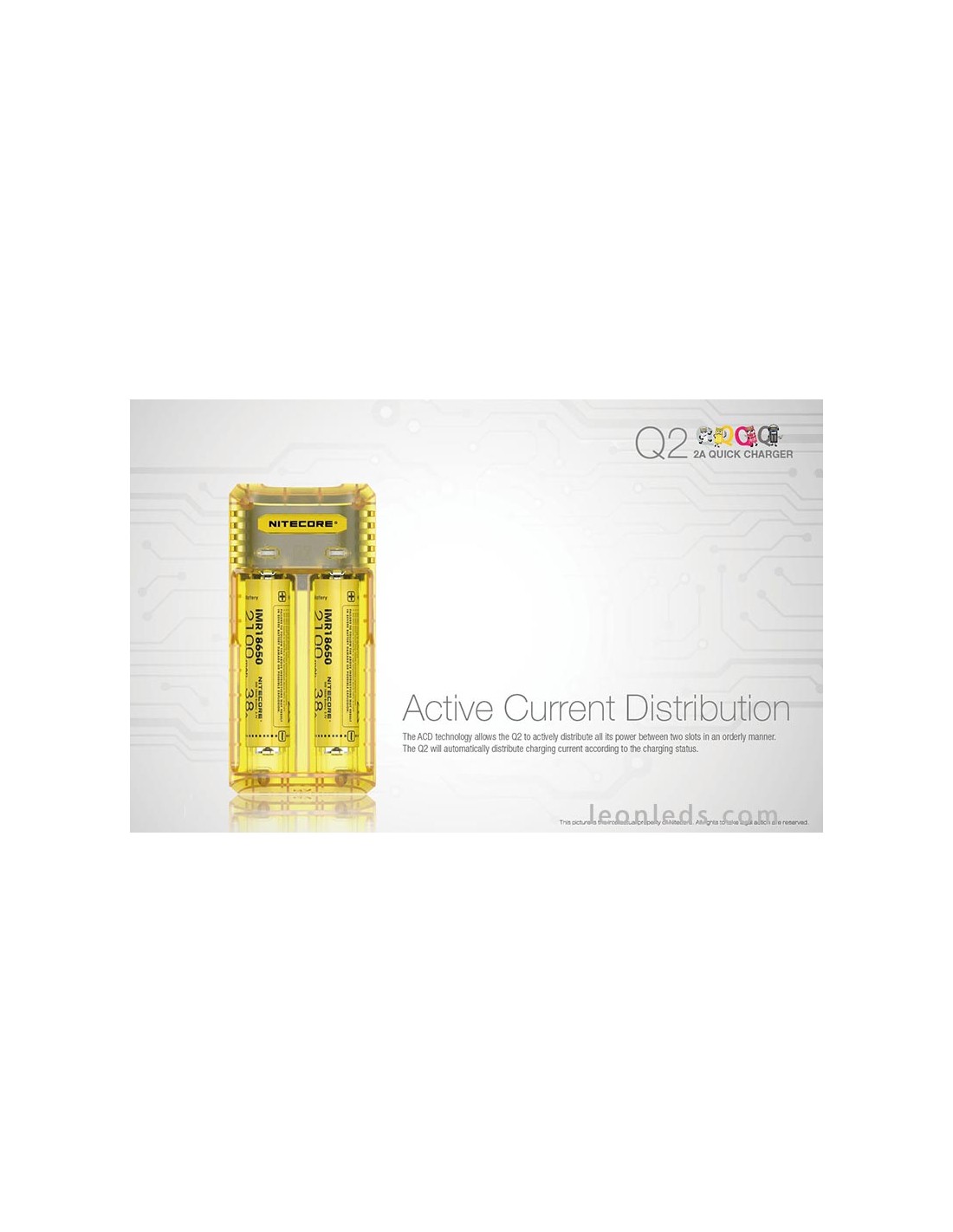 Ladegerät mit 2 Schacht von der Marke Nitecore Modell Q2 in Limongelb, ein Schnellladegerät mit bis zu 2 Ampere, ein revolutionäres Ladegerät für IMR-Batterien, das 2 Li-ion-Batterien gleichzeitig unabhängig laden kann. Ein Ladegerät, das für die Nutzung im Auto mit dem entsprechenden Adapter geeignet ist (nicht enthalten).