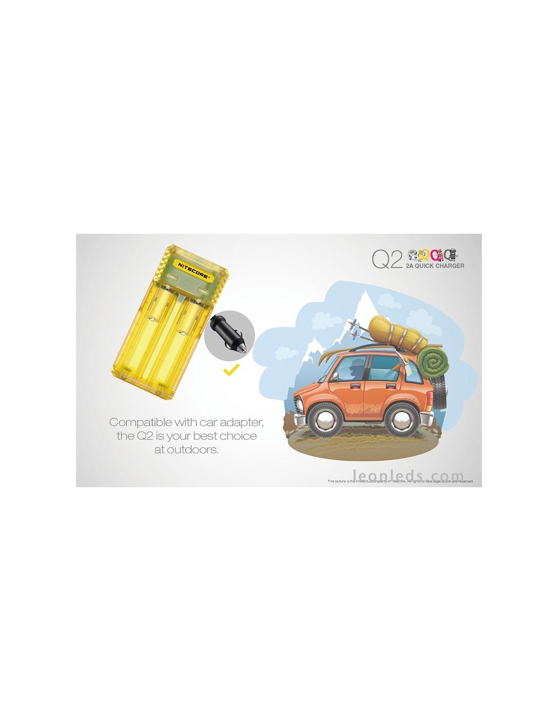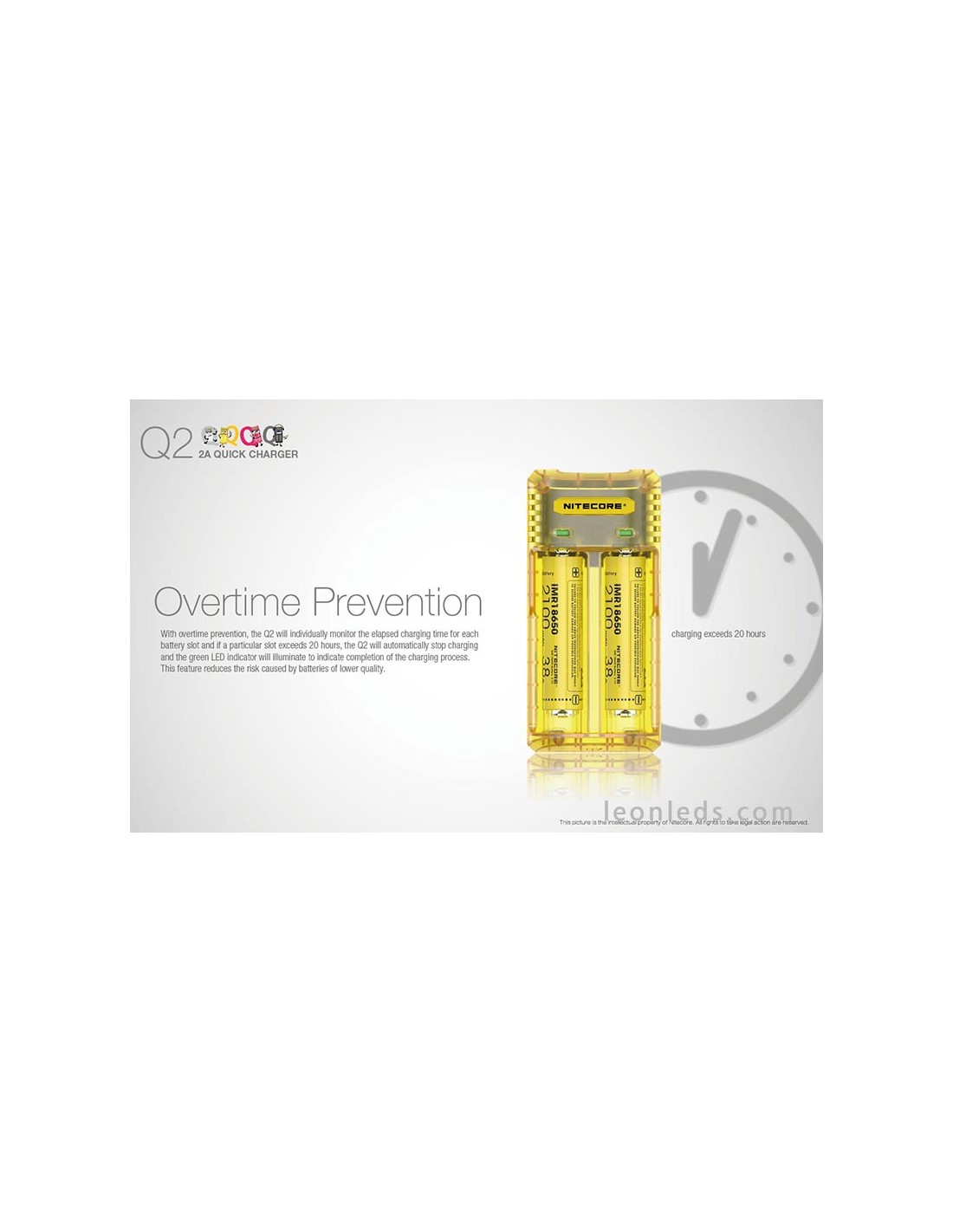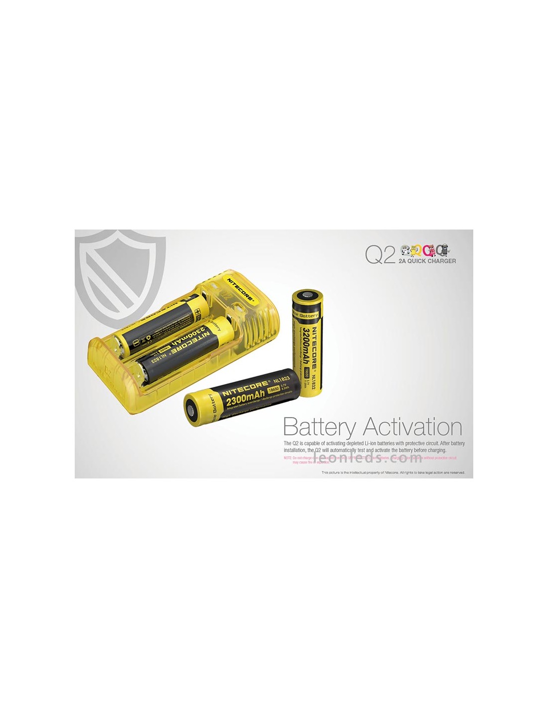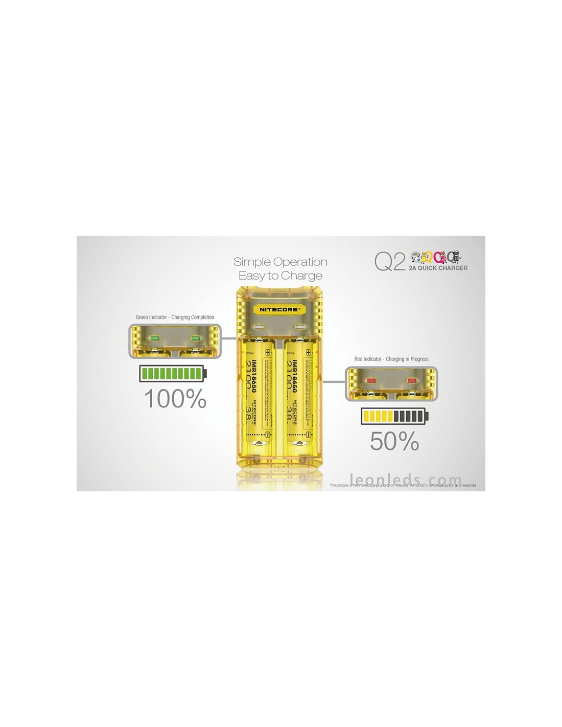 Ladegerät mit 2 Schacht von der Marke Nitecore Modell Q2 in Limongelb, ein Schnellladegerät mit bis zu 2 Ampere, ein revolutionäres Ladegerät für IMR-Batterien, das 2 Li-ion-Batterien gleichzeitig unabhängig laden kann. Ein Ladegerät, das für die Nutzung im Auto mit dem entsprechenden Adapter geeignet ist (nicht enthalten).